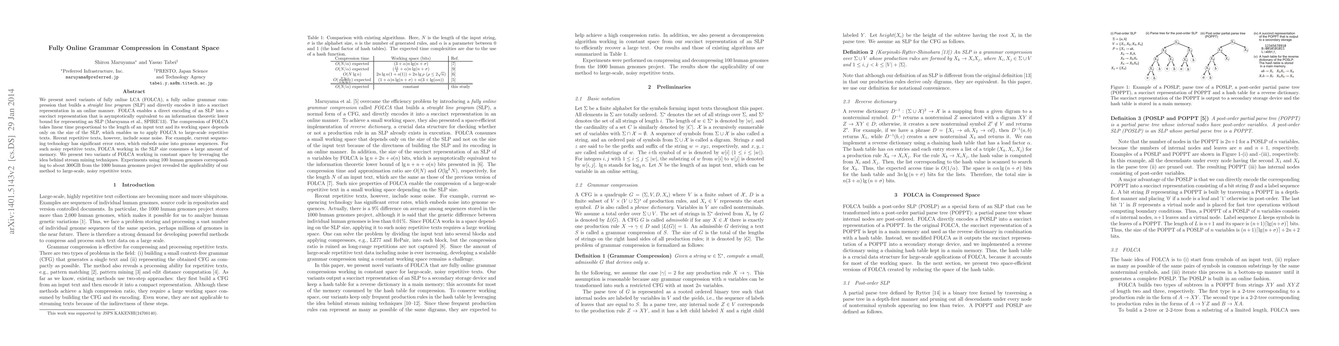 This paper introduces novel variants of fully online grammar compression (FOLCA) that encode straight line programs (SLP) into succinct representations in constant space, enabling efficient handling of large-scale, noisy repetitive texts like genome sequences. The proposed method maintains linear time complexity relative to input length and demonstrates effectiveness through experiments on human genome data.