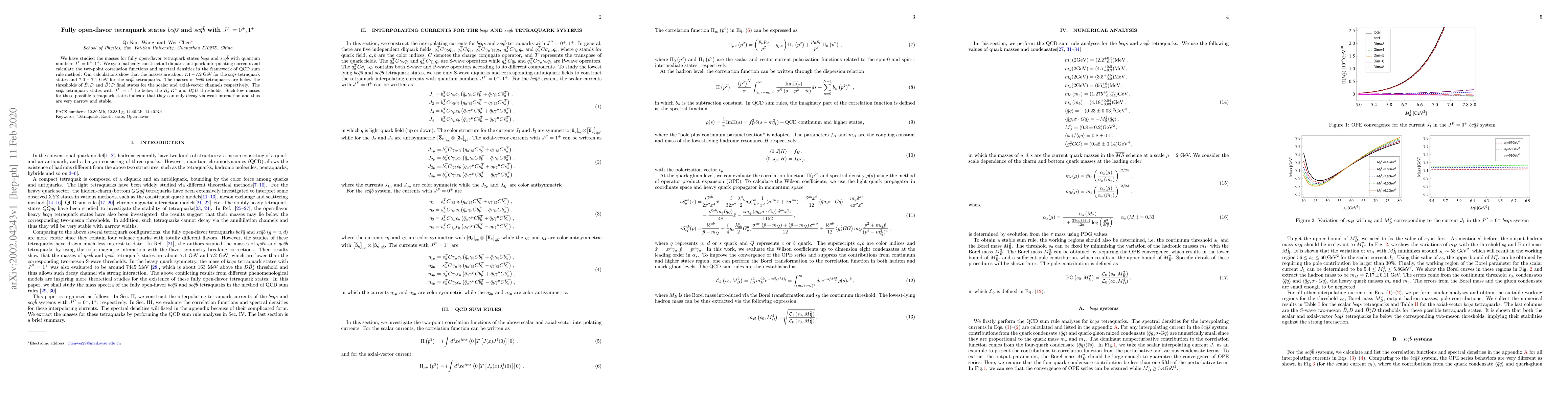 This paper investigates the masses of fully open-flavor tetraquark states $bc\bar{q}\bar{s}$ and $sc\bar{q}\bar{b}$ with $J^{P}=0^{+},1^{+}$ using the QCD sum rule method. The calculated masses are approximately $7.1-7.2$ GeV for $bc\bar{q}\bar{s}$ and $7.0-7.1$ GeV for $sc\bar{q}\bar{b}$, indicating these tetraquarks are narrow and stable due to their decay via weak interaction.