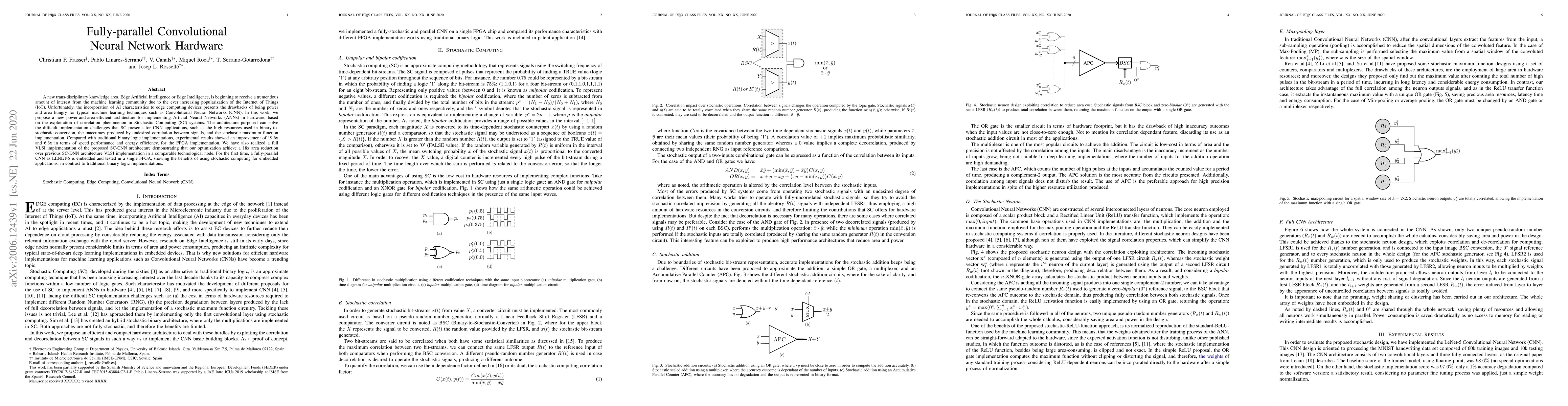 A new trans-disciplinary knowledge area, Edge Artificial Intelligence or Edge Intelligence, is beginning to receive a tremendous amount of interest from the machine learning community due to the ever increasing popularization of the Internet of Things (IoT). Unfortunately, the incorporation of AI characteristics to edge computing devices presents the drawbacks of being power and area hungry for typical machine learning techniques such as Convolutional Neural Networks (CNN). In this work, we propose a new power-and-area-efficient architecture for implementing Articial Neural Networks (ANNs) in hardware, based on the exploitation of correlation phenomenon in Stochastic Computing (SC) systems. The architecture purposed can solve the difficult implementation challenges that SC presents for CNN applications, such as the high resources used in binary-tostochastic conversion, the inaccuracy produced by undesired correlation between signals, and the stochastic maximum function implementation. Compared with traditional binary logic implementations, experimental results showed an improvement of 19.6x and 6.3x in terms of speed performance and energy efficiency, for the FPGA implementation. We have also realized a full VLSI implementation of the proposed SC-CNN architecture demonstrating that our optimization achieve a 18x area reduction over previous SC-DNN architecture VLSI implementation in a comparable technological node. For the first time, a fully-parallel CNN as LENET-5 is embedded and tested in a single FPGA, showing the benefits of using stochastic computing for embedded applications, in contrast to traditional binary logic implementations.