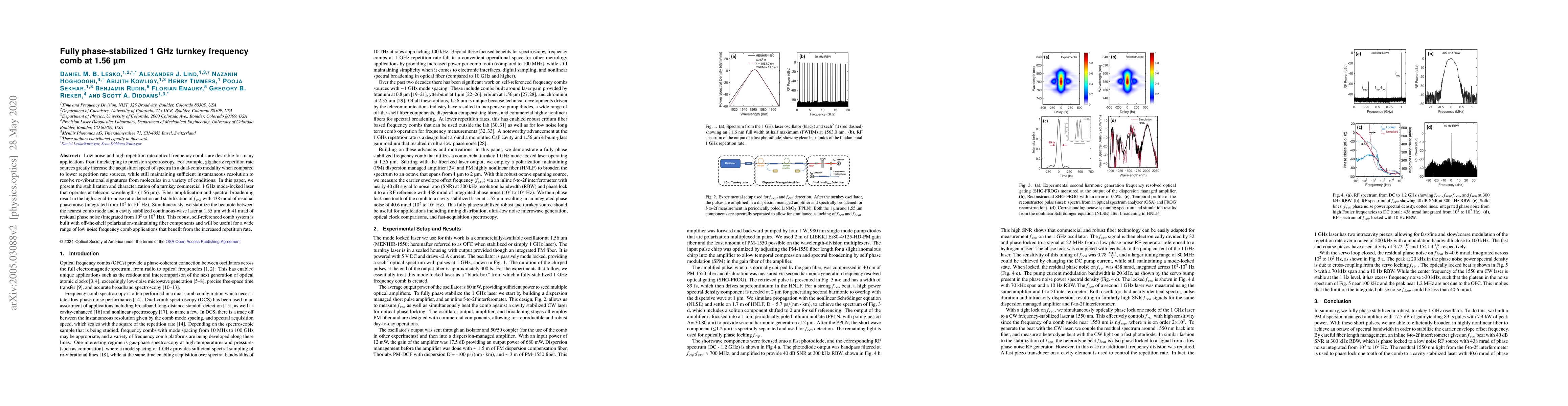 This paper presents a fully phase-stabilized 1 GHz turnkey frequency comb operating at 1.56 µm, achieving low noise and high repetition rate suitable for precision spectroscopy and timekeeping. The system demonstrates robust stabilization with minimal residual phase noise, making it ideal for applications requiring rapid spectral acquisition.