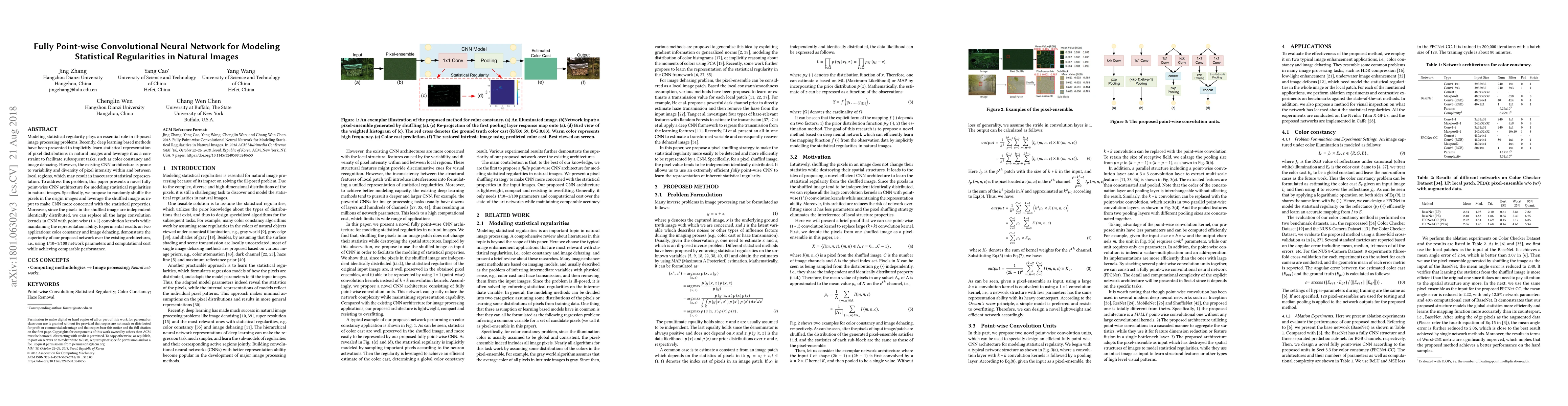 This paper introduces a novel fully point-wise convolutional neural network to model statistical regularities in natural images, addressing the variability in pixel intensity. The proposed method shuffles image pixels to focus on statistical properties, replacing large convolution kernels with point-wise convolutions, leading to significant parameter and computational reductions while maintaining performance in color constancy and image dehazing tasks.