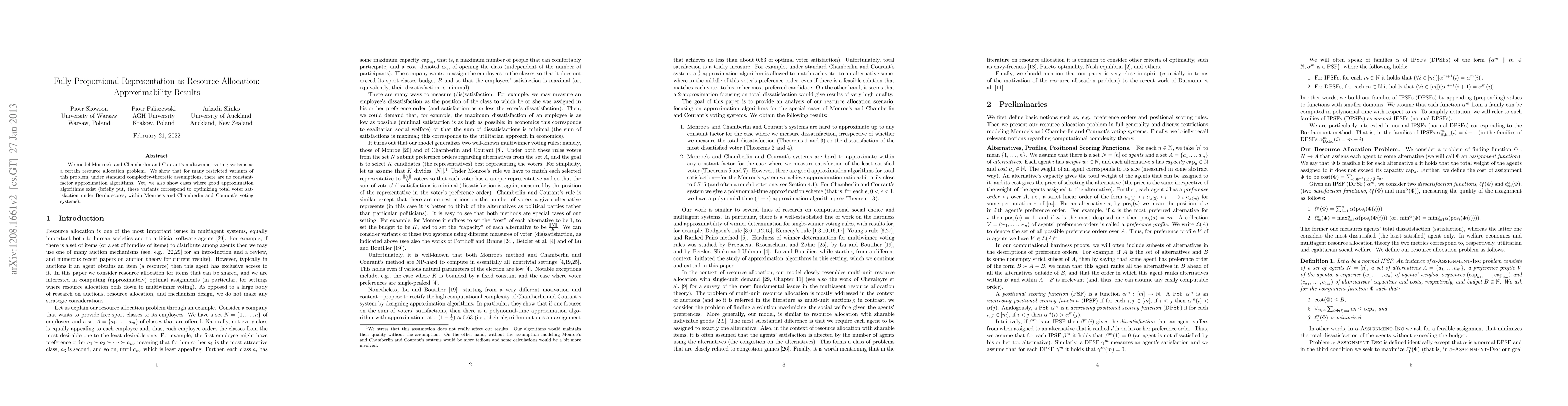 We model Monroe's and Chamberlin and Courant's multiwinner voting systems as a certain resource allocation problem. We show that for many restricted variants of this problem, under standard complexity-theoretic assumptions, there are no constant-factor approximation algorithms. Yet, we also show cases where good approximation algorithms exist (briefly put, these variants correspond to optimizing total voter satisfaction under Borda scores, within Monroe's and Chamberlin and Courant's voting systems).