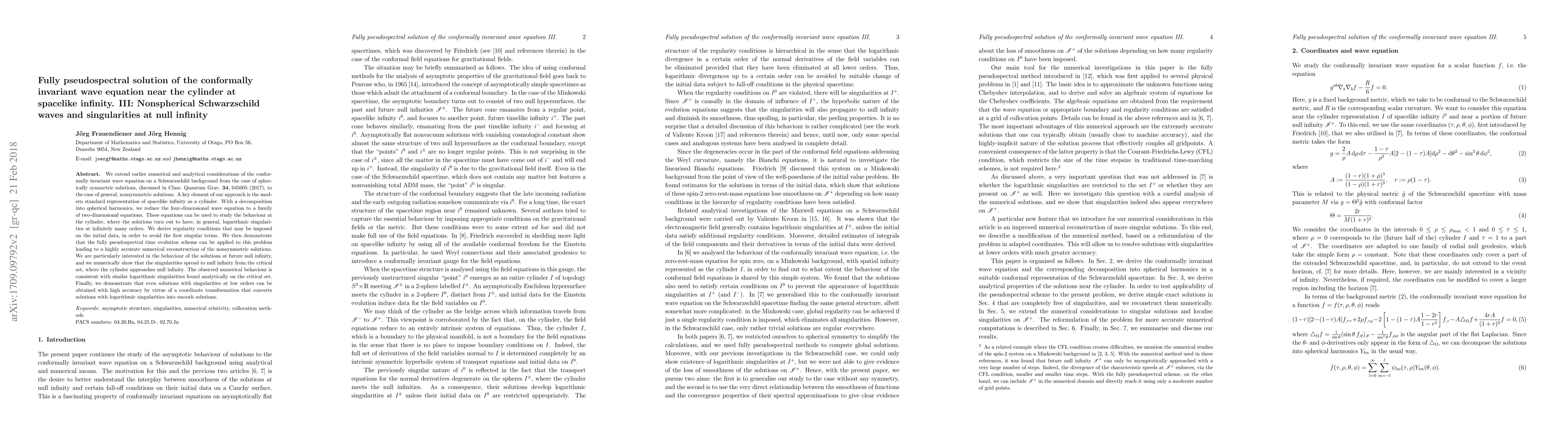 We extend earlier numerical and analytical considerations of the conformally invariant wave equation on a Schwarzschild background from the case of spherically symmetric solutions, discussed in Class. Quantum Grav. 34, 045005 (2017), to the case of general, nonsymmetric solutions. A key element of our approach is the modern standard representation of spacelike infinity as a cylinder. With a decomposition into spherical harmonics, we reduce the four-dimensional wave equation to a family of two-dimensional equations. These equations can be used to study the behaviour at the cylinder, where the solutions turn out to have logarithmic singularities at infinitely many orders. We derive regularity conditions that may be imposed on the initial data, in order to avoid the first singular terms. We then demonstrate that the fully pseudospectral time evolution scheme can be applied to this problem leading to a highly accurate numerical reconstruction of the nonsymmetric solutions. We are particularly interested in the behaviour of the solutions at future null infinity, and we numerically show that the singularities spread from the cylinder to null infinity. The observed numerical behaviour is consistent with similar logarithmic singularities found analytically on the cylinder. Finally, we demonstrate that even solutions with singularities at low orders can be obtained with high accuracy by virtue of a coordinate transformation that converts functions with logarithmic singularities into smooth solutions.