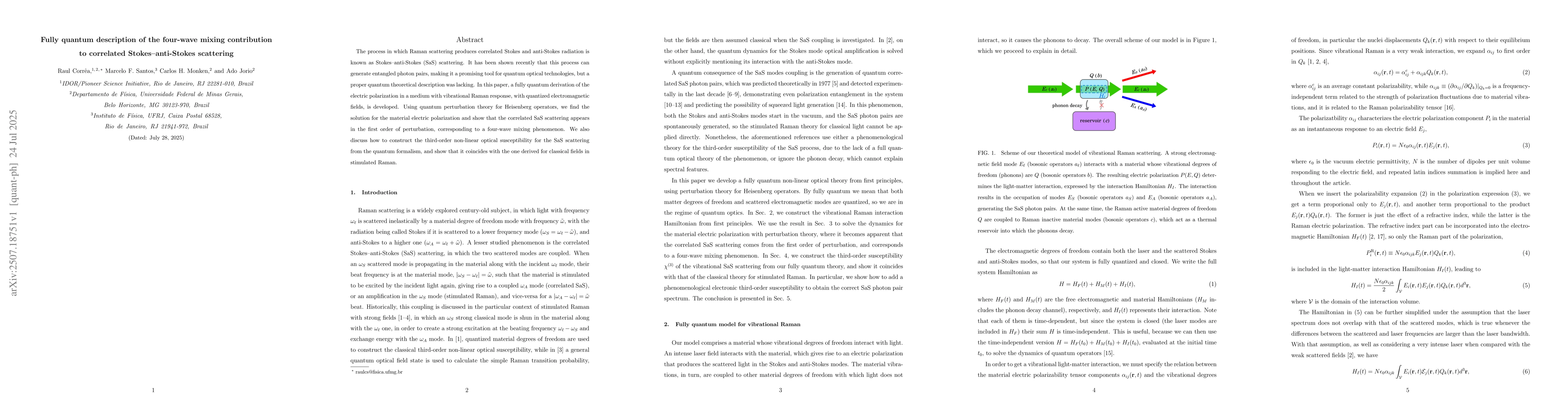 The process in which Raman scattering produces correlated Stokes and anti-Stokes radiation is known as Stokes-anti-Stokes (SaS) scattering. It has been shown recently that this process can generate entangled photon pairs, making it a promising tool for quantum optical technologies, but a proper quantum theoretical description was lacking. In this paper, a fully quantum derivation of the electric polarization in a medium with vibrational Raman response, with quantized electromagnetic fields, is developed. Using quantum perturbation theory for Heisenberg operators, we find the solution for the material electric polarization and show that the correlated SaS scattering appears in the first order of perturbation, corresponding to a four-wave mixing phenomenon. We also discuss how to construct the third-order non-linear optical susceptibility for the SaS scattering from the quantum formalism, and show that it coincides with the one derived for classical fields in stimulated Raman.