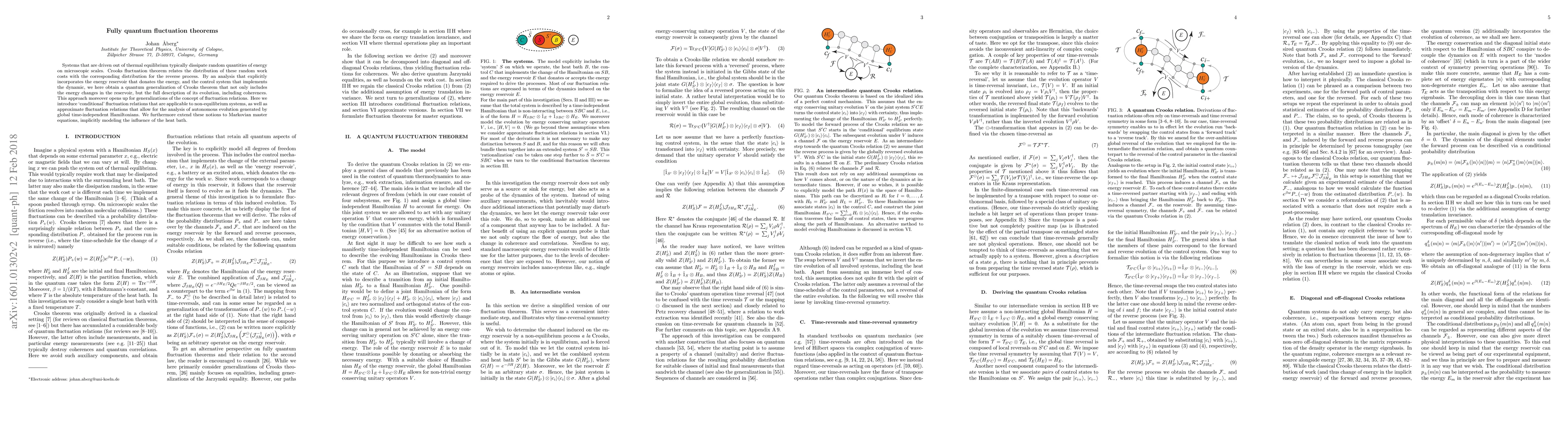This paper generalizes Crooks fluctuation theorem to quantum systems, incorporating the full evolution of an energy reservoir, including coherences. It introduces conditional and approximate fluctuation relations for non-equilibrium systems and extends these concepts to Markovian master equations.
