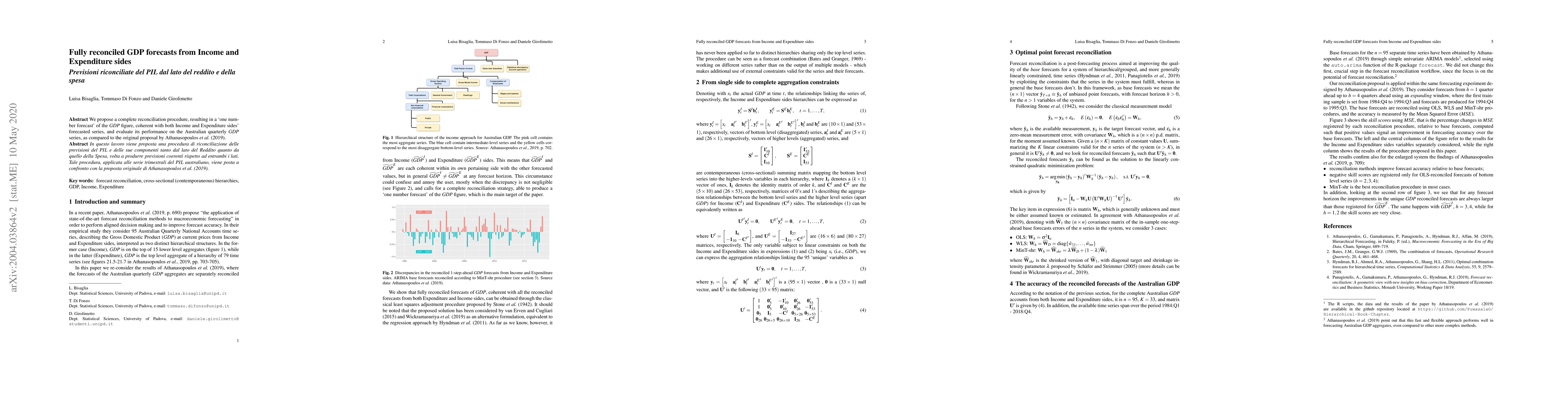 We propose a complete reconciliation procedure, resulting in a 'one number forecast' of the GDP figure, coherent with both Income and Expenditure sides' forecasted series, and evaluate its performance on the Australian quarterly GDP series, as compared to the original proposal by Athanasopoulos et al. (2019).