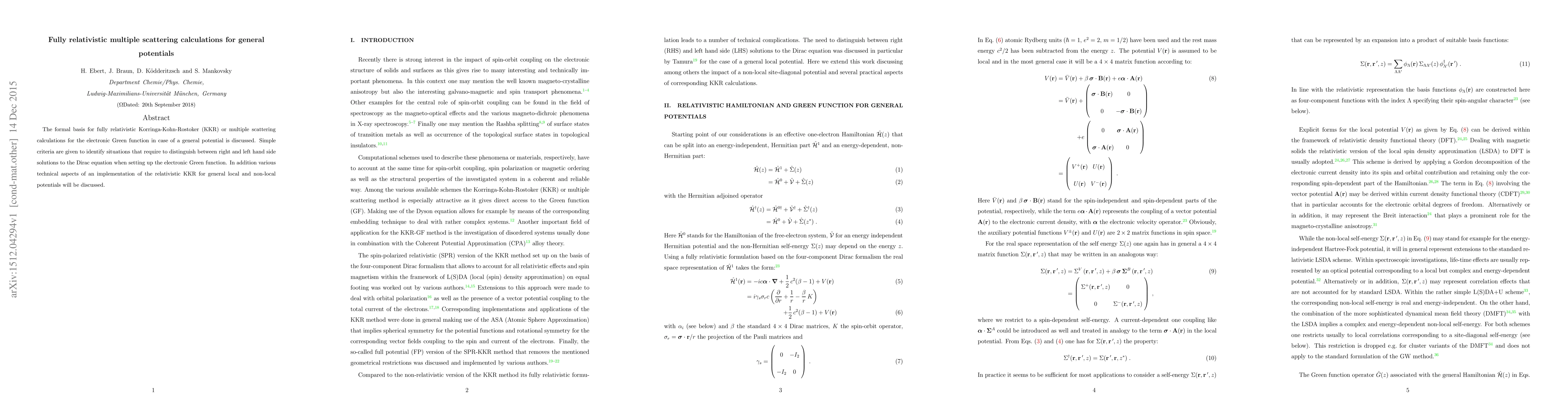 This paper lays out the theoretical framework for fully relativistic multiple scattering calculations using the Korringa-Kohn-Rostoker (KKR) method for electronic Green functions under general potentials. It also provides criteria for distinguishing between solutions to the Dirac equation and discusses technical implementation aspects for both local and non-local potentials.