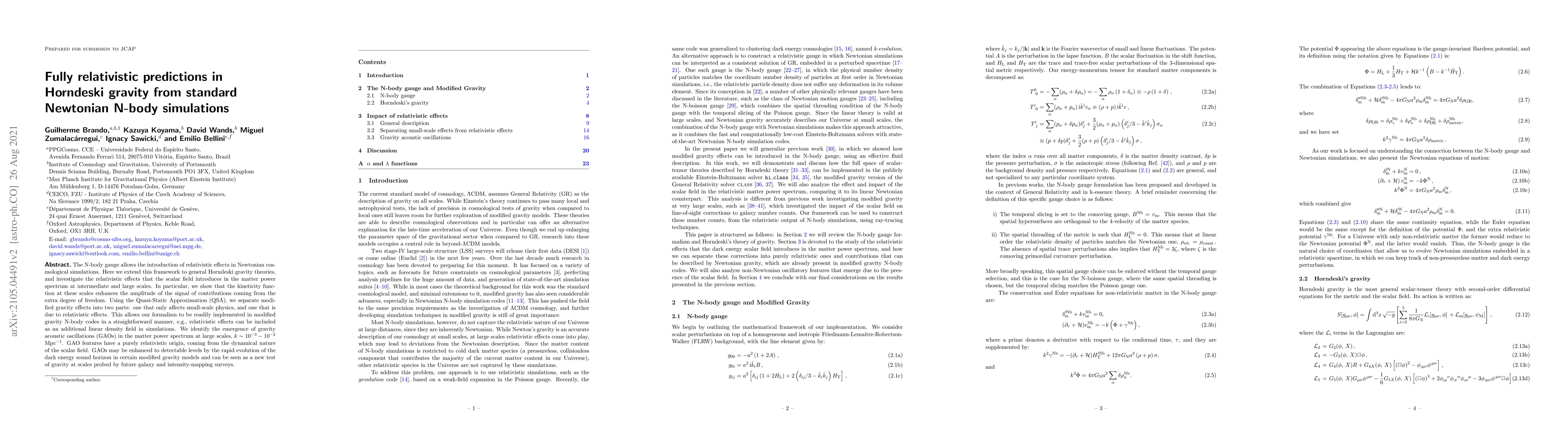 The N-body gauge allows the introduction of relativistic effects in Newtonian cosmological simulations. Here we extend this framework to general Horndeski gravity theories, and investigate the relativistic effects that the scalar field introduces in the matter power spectrum at intermediate and large scales. In particular, we show that the kineticity function at these scales enhances the amplitude of the signal of contributions coming from the extra degree of freedom. Using the Quasi-Static Approximation (QSA), we separate modified gravity effects into two parts: one that only affects small-scale physics, and one that is due to relativistic effects. This allows our formalism to be readily implemented in modified gravity N-body codes in a straightforward manner, e.g., relativistic effects can be included as an additional linear density field in simulations. We identify the emergence of gravity acoustic oscillations (GAOs) in the matter power spectrum at large scales, $k \sim 10^{-3}-10^{-2}$ Mpc$^{-1}$. GAO features have a purely relativistic origin, coming from the dynamical nature of the scalar field. GAOs may be enhanced to detectable levels by the rapid evolution of the dark energy sound horizon in certain modified gravity models and can be seen as a new test of gravity at scales probed by future galaxy and intensity-mapping surveys.