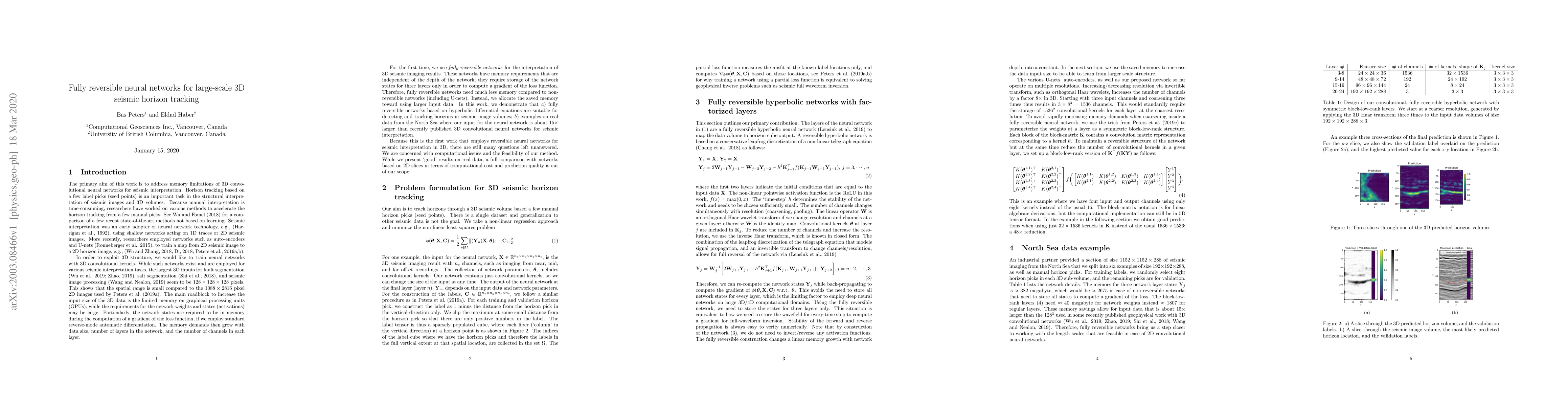 This paper introduces a fully reversible neural network designed for large-scale 3D seismic horizon tracking, overcoming memory limitations by using factorized layers that maintain a constant memory requirement regardless of network depth. The approach allows for increased input size and better learning from large geological structures, as demonstrated by a field data example.
