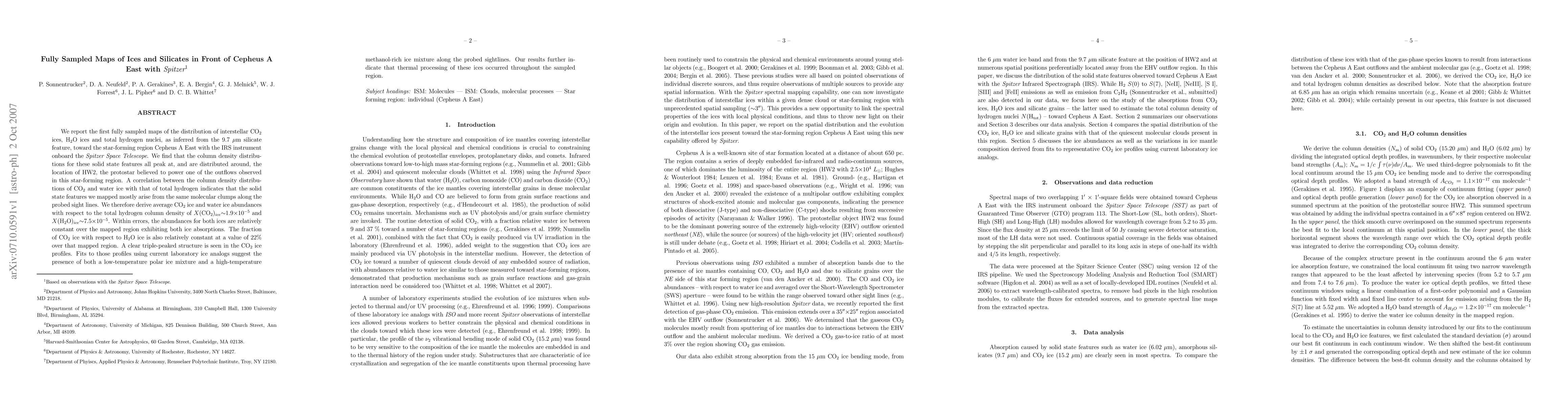 This study presents the first fully sampled maps of CO2 and H2O ices and silicates in Cepheus A East using Spitzer's IRS instrument, revealing that these ices peak around the protostar HW2. The study finds consistent CO2 and H2O ice abundances relative to hydrogen, suggesting they originate from the same molecular clumps.