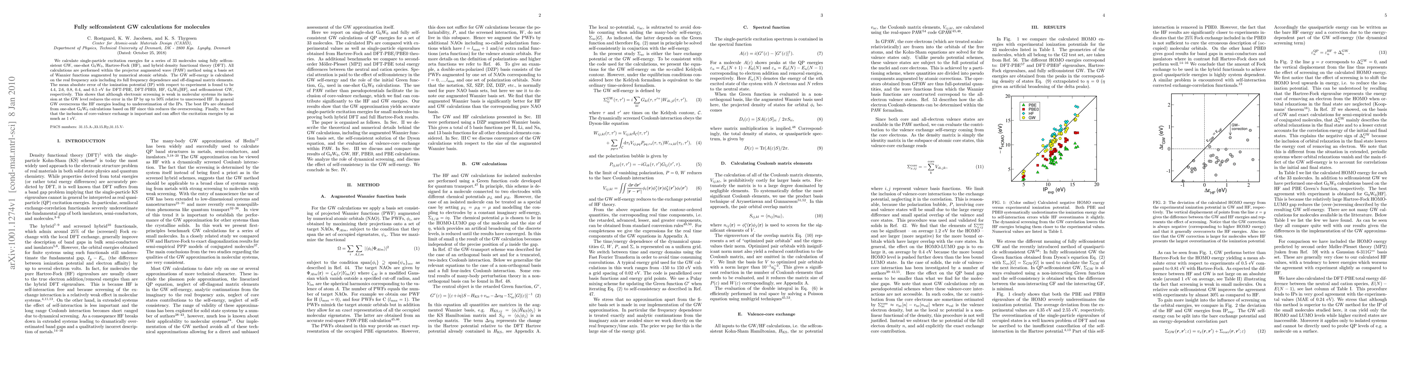We calculate single-particle excitation energies for a series of 33 molecules using fully selfconsistent GW, one-shot G$_0$W$_0$, Hartree-Fock (HF), and hybrid density functional theory (DFT). All calculations are performed within the projector augmented wave (PAW) method using a basis set of Wannier functions augmented by numerical atomic orbitals. The GW self-energy is calculated on the real frequency axis including its full frequency dependence and off-diagonal matrix elements. The mean absolute error of the ionization potential (IP) with respect to experiment is found to be 4.4, 2.6, 0.8, 0.4, and 0.5 eV for DFT-PBE, DFT-PBE0, HF, G$_0$W$_0$[HF], and selfconsistent GW, respectively. This shows that although electronic screening is weak in molecular systems its inclusion at the GW level reduces the error in the IP by up to 50% relative to unscreened HF. In general GW overscreens the HF energies leading to underestimation of the IPs. The best IPs are obtained from one-shot G$_0$W$_0$ calculations based on HF since this reduces the overscreening. Finally, we find that the inclusion of core-valence exchange is important and can affect the excitation energies by as much as 1 eV.