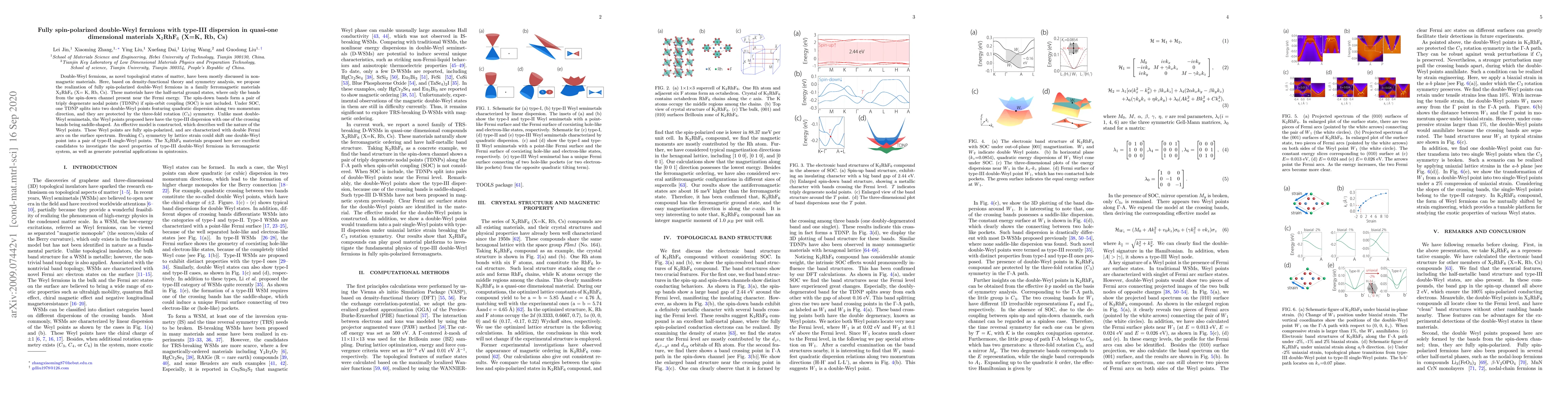 This paper proposes the existence of fully spin-polarized double-Weyl fermions with type-III dispersion in quasi-one-dimensional ferromagnetic materials X2RhF6 (X=K, Rb, Cs). These materials exhibit half-metallic ground states, with potential applications in spintronics and novel topological properties.