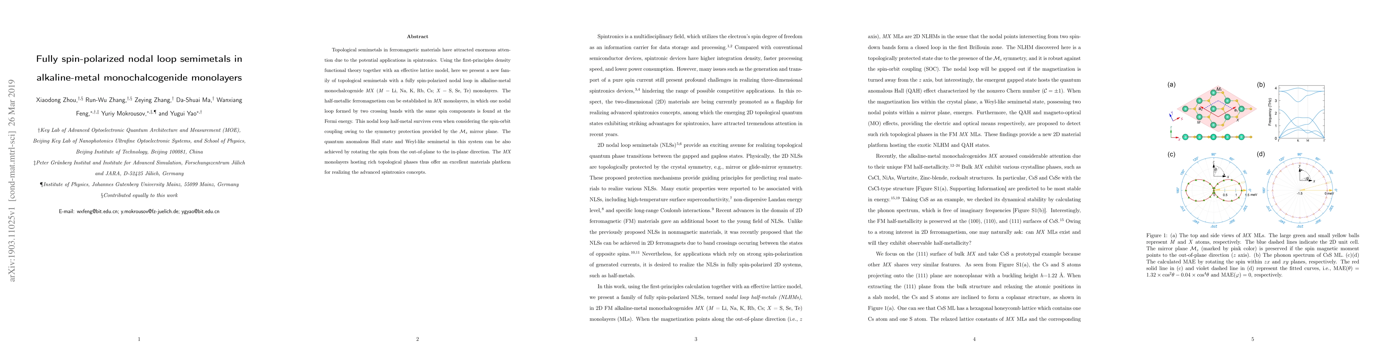 This paper identifies a new class of topological semimetals in alkaline-metal monochalcogenide monolayers, featuring a fully spin-polarized nodal loop protected by symmetry. These materials exhibit half-metallic ferromagnetism and potential for advanced spintronics applications.