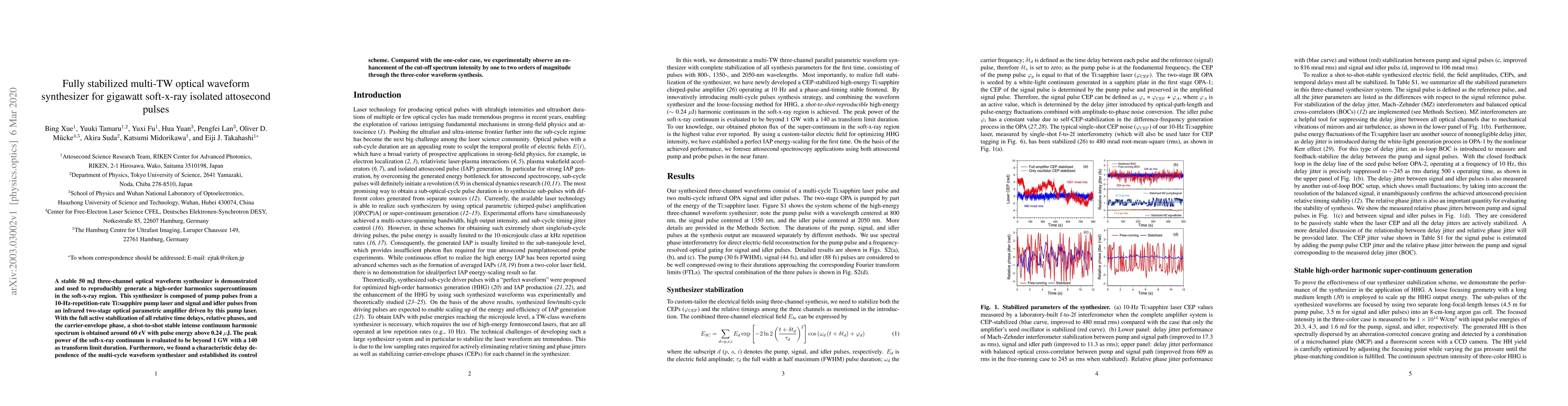 The development of a three-channel optical waveform synthesizer for generating gigawatt soft-x-ray isolated attosecond pulses.