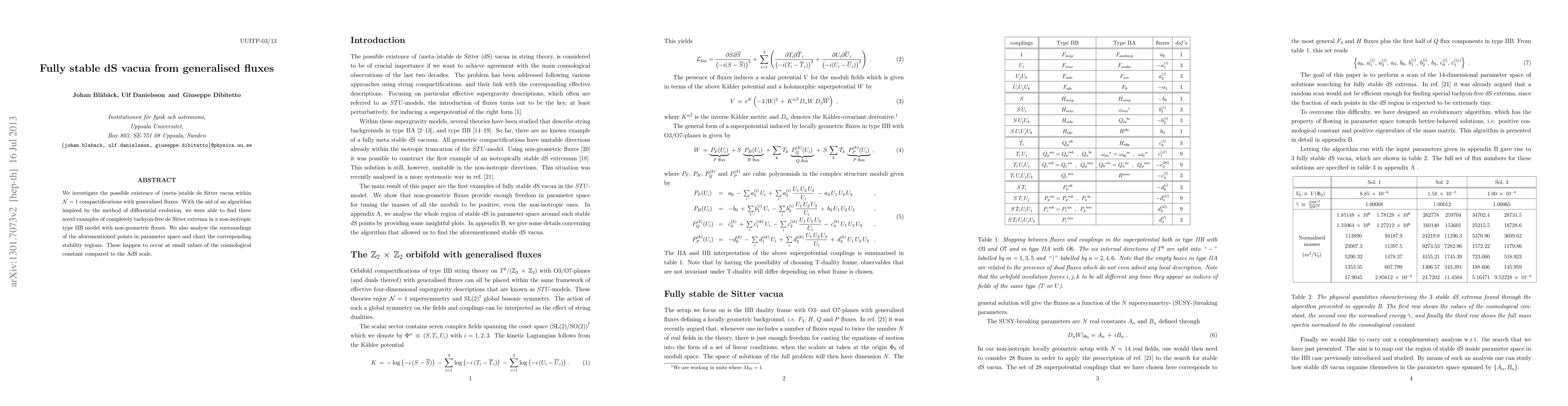 We investigate the possible existence of (meta-)stable de Sitter vacua within N=1 compactifications with generalised fluxes. With the aid of an algorithm inspired by the method of differential evolution, we were able to find three novel examples of completely tachyon-free de Sitter extrema in a non-isotropic type IIB model with non-geometric fluxes. We also analyse the surroundings of the aforementioned points in parameter space and chart the corresponding stability regions. These happen to occur at small values of the cosmological constant compared to the AdS scale.