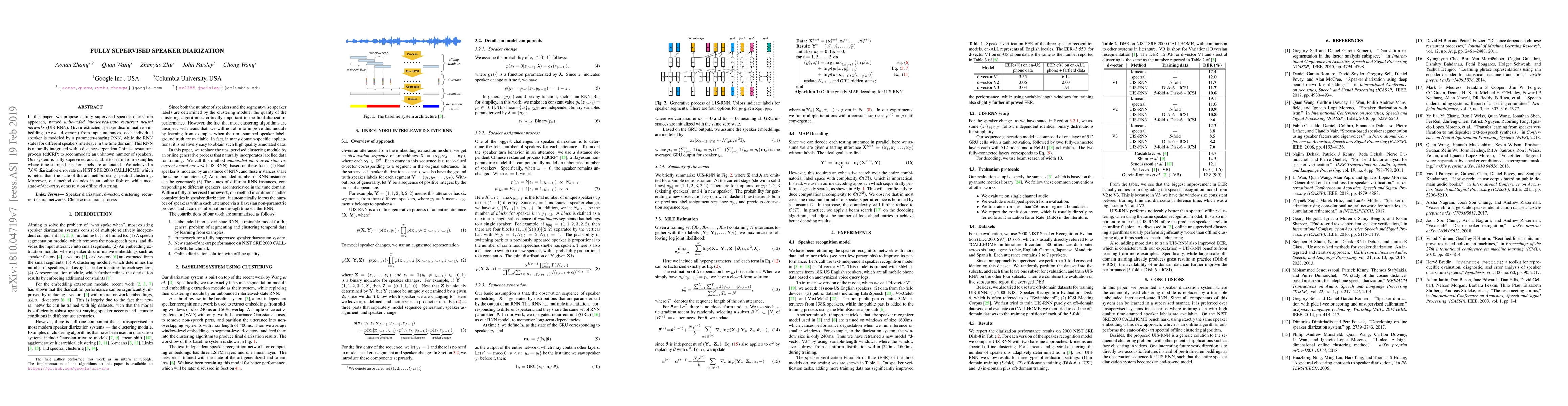 This paper presents a fully supervised speaker diarization method using unbounded interleaved-state recurrent neural networks (UIS-RNN) that models speakers with parameter-sharing RNNs and integrates with a distance-dependent Chinese restaurant process (ddCRP). The approach achieves a 7.6% diarization error rate on NIST SRE 2000 CALLHOME, outperforming state-of-the-art spectral clustering methods and operates in an online fashion.