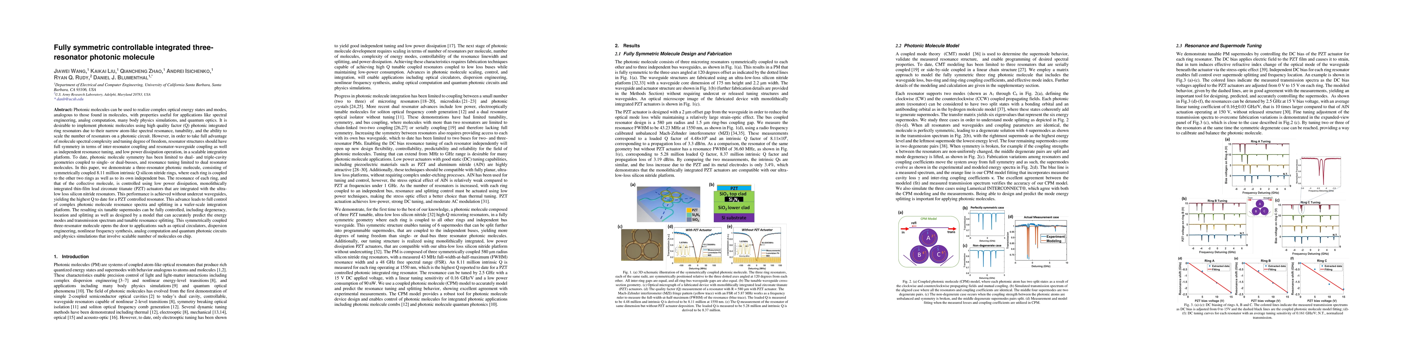 This paper demonstrates a fully symmetric, tunable three-resonator photonic molecule using high-quality silicon nitride rings, controlled by low-power PZT actuators, achieving the highest Q factor to date and enabling precise control over complex photonic resonance spectra.