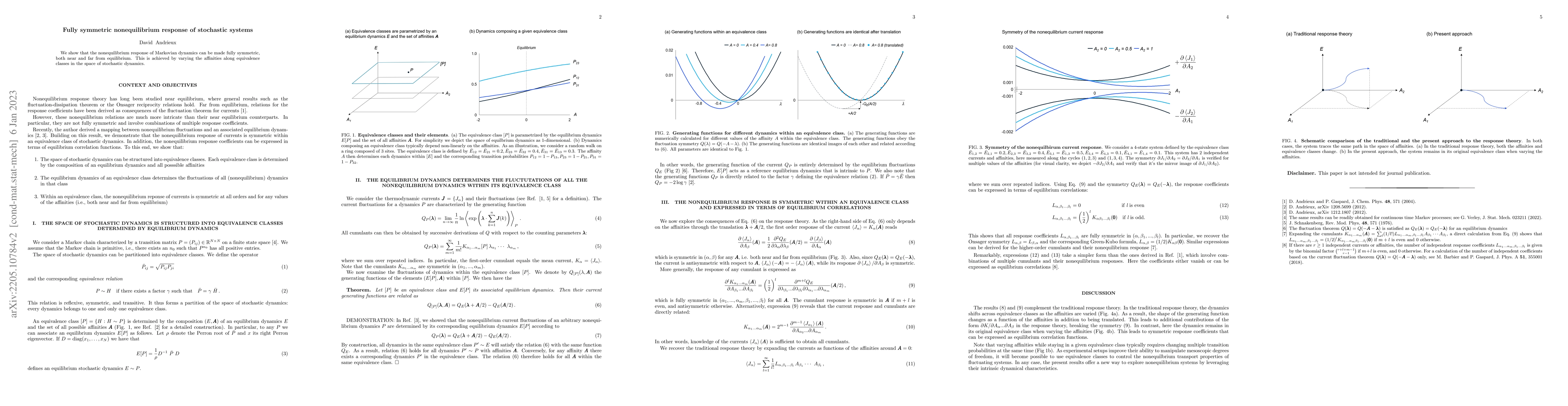 The paper presents a theoretical framework for achieving fully symmetric nonequilibrium response in stochastic systems by varying affinities within equivalence classes, providing a direct relationship between current response coefficients and equilibrium correlations.