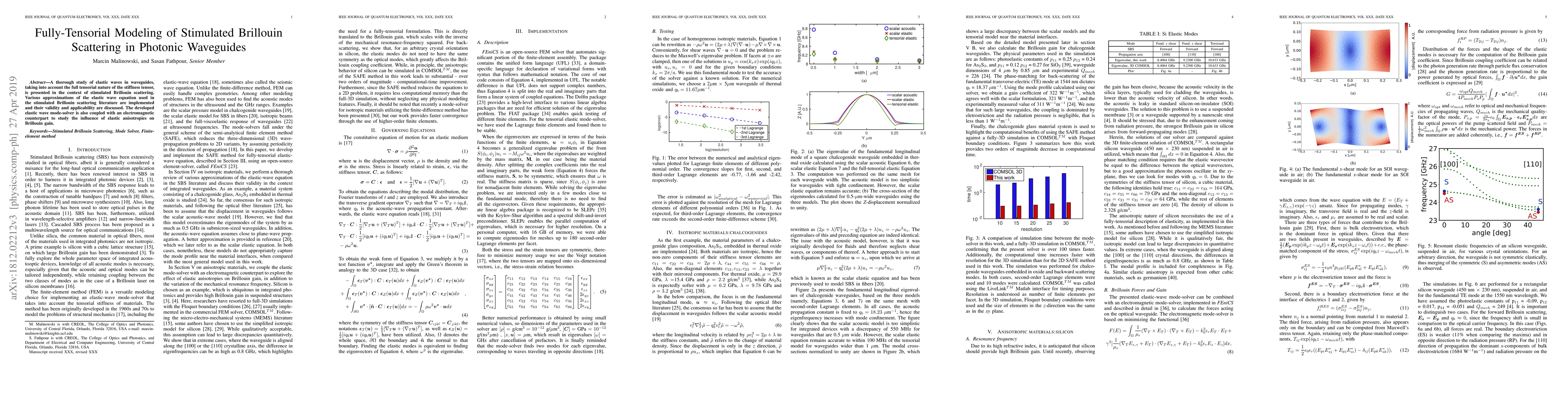 A framework for simulating the elastic-wave modes in waveguides, taking into account the full tensorial nature of the stiffness tensor, is presented and implemented in the open-source finite element solver, FEniCS. Various approximations of the elastic wave equation used in the stimulated Brillouin scattering literature are implemented and their validity and applicability are discussed. The elastic mode-solver is also coupled with an electromagnetic counterpart to study the influence of elastic anisotropies on Brillouin gain.