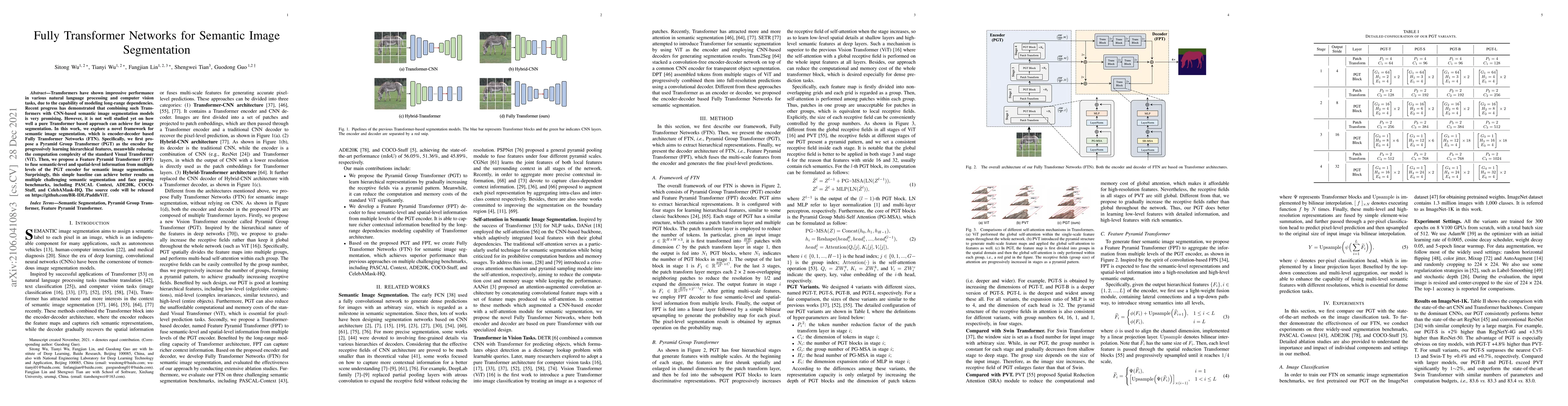 This paper proposes Fully Transformer Networks (FTN) for semantic image segmentation, introducing a Pyramid Group Transformer (PGT) for hierarchical feature learning and a Feature Pyramid Transformer (FPT) for information fusion. The approach outperforms baselines on several benchmarks, indicating the potential of pure Transformer models in image segmentation.