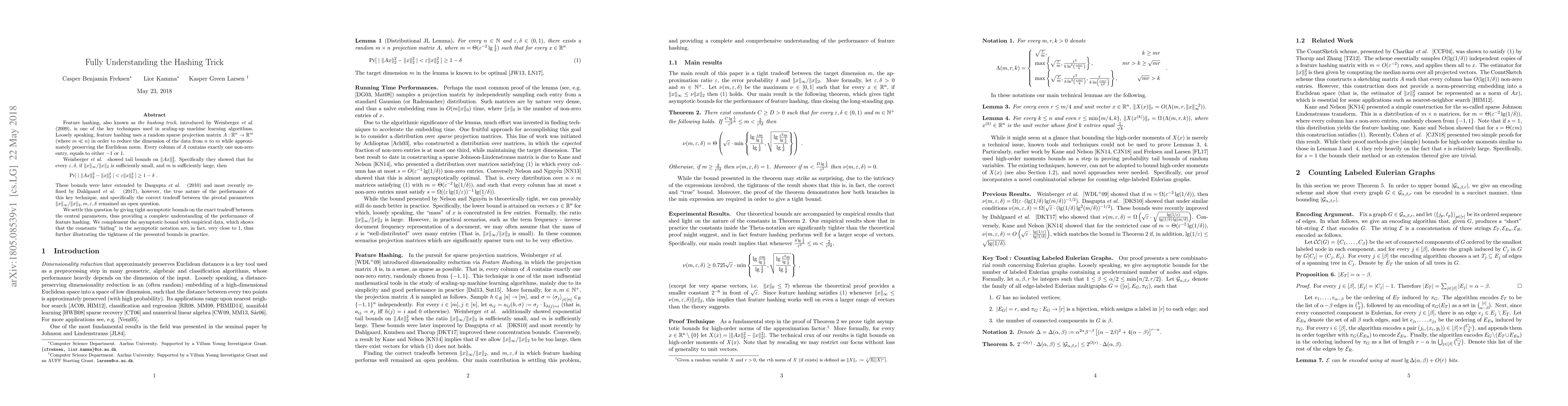 Feature hashing, also known as {\em the hashing trick}, introduced by Weinberger et al. (2009), is one of the key techniques used in scaling-up machine learning algorithms. Loosely speaking, feature hashing uses a random sparse projection matrix $A : \mathbb{R}^n \to \mathbb{R}^m$ (where $m \ll n$) in order to reduce the dimension of the data from $n$ to $m$ while approximately preserving the Euclidean norm. Every column of $A$ contains exactly one non-zero entry, equals to either $-1$ or $1$. Weinberger et al. showed tail bounds on $\|Ax\|_2^2$. Specifically they showed that for every $\varepsilon, \delta$, if $\|x\|_{\infty} / \|x\|_2$ is sufficiently small, and $m$ is sufficiently large, then $$\Pr[ \; | \;\|Ax\|_2^2 - \|x\|_2^2\; | < \varepsilon \|x\|_2^2 \;] \ge 1 - \delta \;.$$ These bounds were later extended by Dasgupta \etal (2010) and most recently refined by Dahlgaard et al. (2017), however, the true nature of the performance of this key technique, and specifically the correct tradeoff between the pivotal parameters $\|x\|_{\infty} / \|x\|_2, m, \varepsilon, \delta$ remained an open question. We settle this question by giving tight asymptotic bounds on the exact tradeoff between the central parameters, thus providing a complete understanding of the performance of feature hashing. We complement the asymptotic bound with empirical data, which shows that the constants "hiding" in the asymptotic notation are, in fact, very close to $1$, thus further illustrating the tightness of the presented bounds in practice.