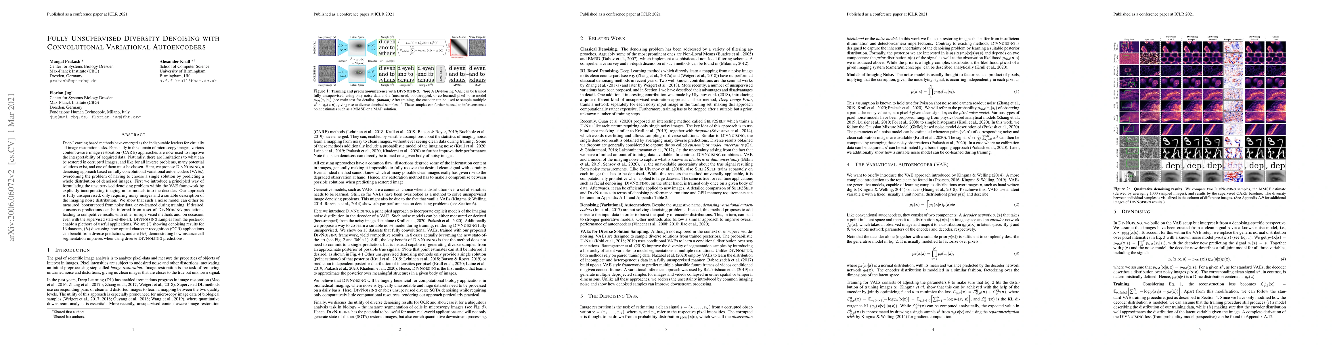 This paper proposes DivNoising, a fully unsupervised denoising method using convolutional variational autoencoders (VAEs) to generate a distribution of denoised images instead of a single solution. The approach incorporates imaging noise models into the VAE framework and can utilize measured, bootstrapped, or co-learned noise descriptions. The method shows competitive results and diverse predictions enhance applications like OCR and cell segmentation.