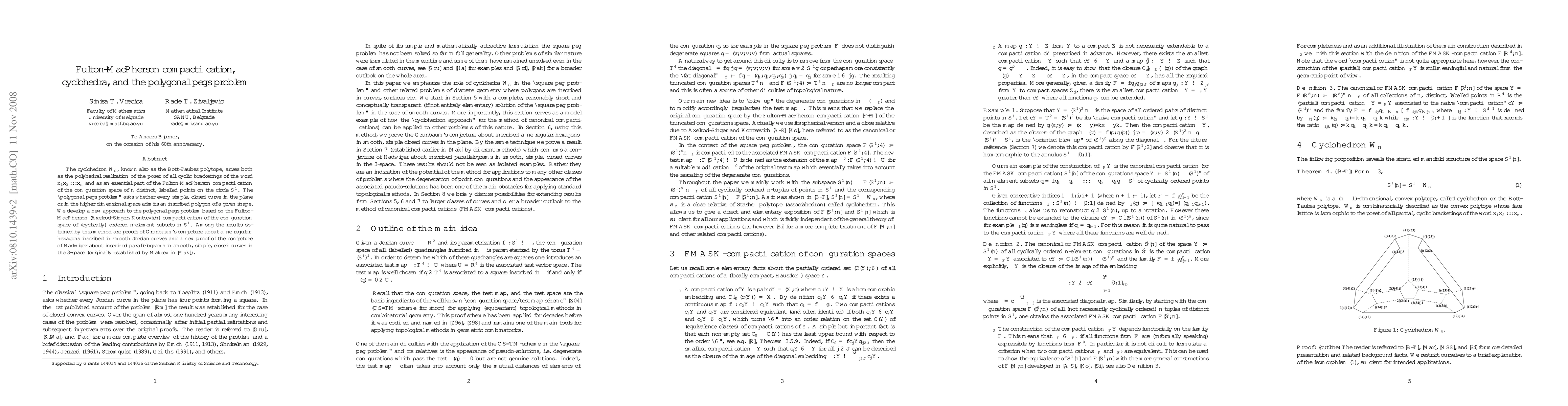 This paper develops a new method using the Fulton-MacPherson compactification to solve the "polygonal pegs problem," proving Grunbaum's conjecture on inscribed affine regular hexagons and providing a new proof for Hadwiger's conjecture on inscribed parallelograms in smooth, simple closed curves in 3-space.
