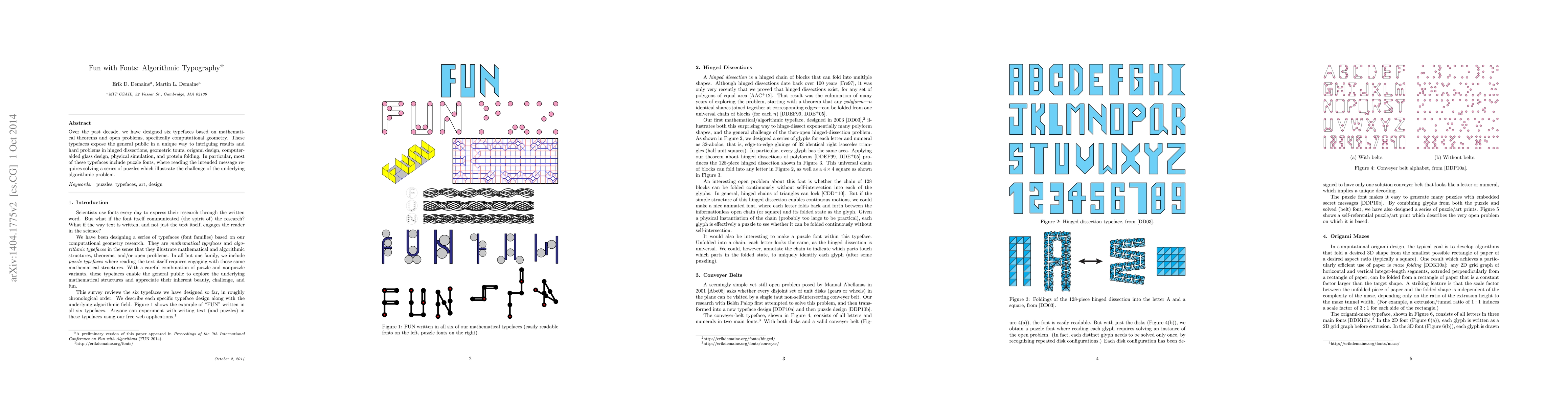 Over the past decade, we have designed six typefaces based on mathematical theorems and open problems, specifically computational geometry. These typefaces expose the general public in a unique way to intriguing results and hard problems in hinged dissections, geometric tours, origami design, computer-aided glass design, physical simulation, and protein folding. In particular, most of these typefaces include puzzle fonts, where reading the intended message requires solving a series of puzzles which illustrate the challenge of the underlying algorithmic problem.