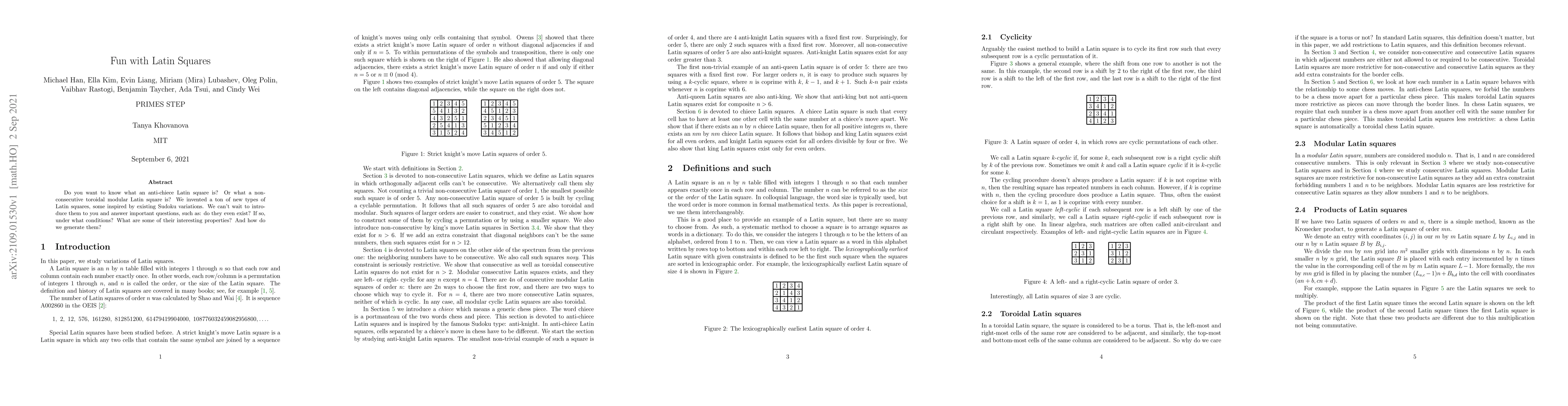 Do you want to know what an anti-chiece Latin square is? Or what a non-consecutive toroidal modular Latin square is? We invented a ton of new types of Latin squares, some inspired by existing Sudoku variations. We can't wait to introduce them to you and answer important questions, such as: do they even exist? If so, under what conditions? What are some of their interesting properties? And how do we generate them?