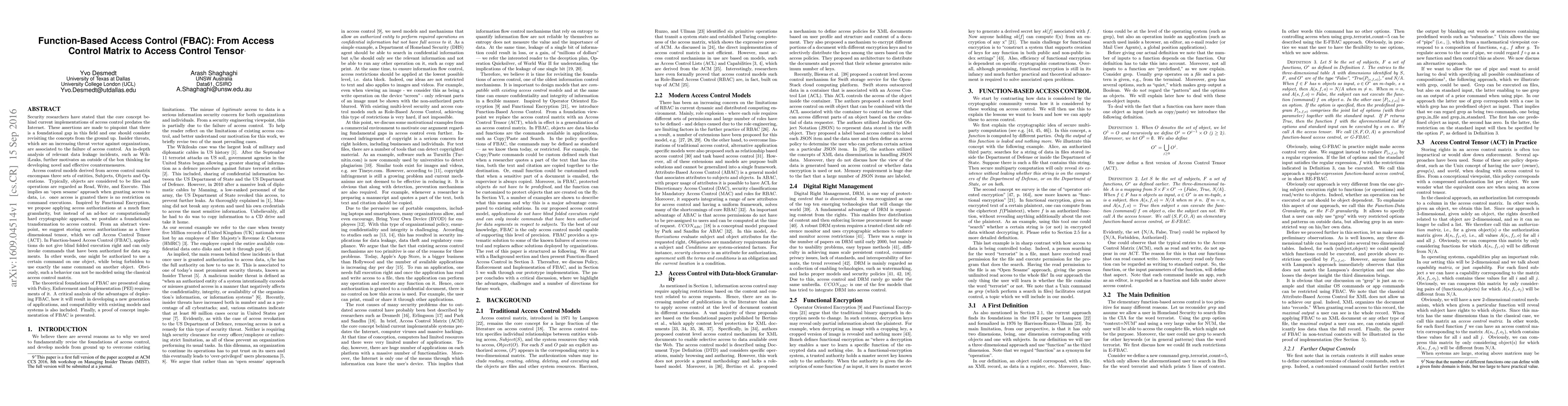 This paper proposes Function-Based Access Control (FBAC), transforming access control from a matrix to a three-dimensional tensor, enabling finer-grained authorization. It aims to mitigate insider threats by allowing specific command executions on data segments, enhancing security over traditional access control models.