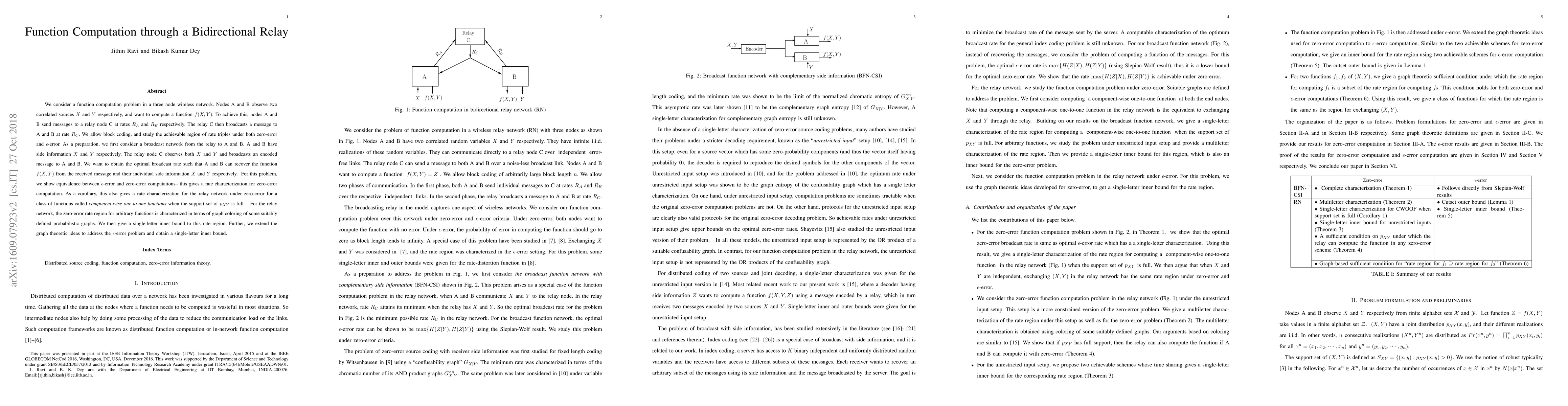 We consider a function computation problem in a three node wireless network. Nodes A and B observe two correlated sources $X$ and $Y$ respectively, and want to compute a function $f(X,Y)$. To achieve this, nodes A and B send messages to a relay node C at rates $R_A$ and $R_B$ respectively. The relay C then broadcasts a message to A and B at rate $R_C$. We allow block coding, and study the achievable region of rate triples under both zero-error and $\epsilon$-error. As a preparation, we first consider a broadcast network from the relay to A and B. A and B have side information $X$ and $Y$ respectively. The relay node C observes both $X$ and $Y$ and broadcasts an encoded message to A and B. We want to obtain the optimal broadcast rate such that A and B can recover the function $f(X,Y)$ from the received message and their individual side information $X$ and $Y$ respectively. For this problem, we show equivalence between $\epsilon$-error and zero-error computations-- this gives a rate characterization for zero-error computation. As a corollary, this also gives a rate characterization for the relay network under zero-error for a class of functions called {\em component-wise one-to-one functions} when the support set of $p_{XY}$ is full. For the relay network, the zero-error rate region for arbitrary functions is characterized in terms of graph coloring of some suitably defined probabilistic graphs. We then give a single-letter inner bound to this rate region. Further, we extend the graph theoretic ideas to address the $\epsilon$-error problem and obtain a single-letter inner bound.
