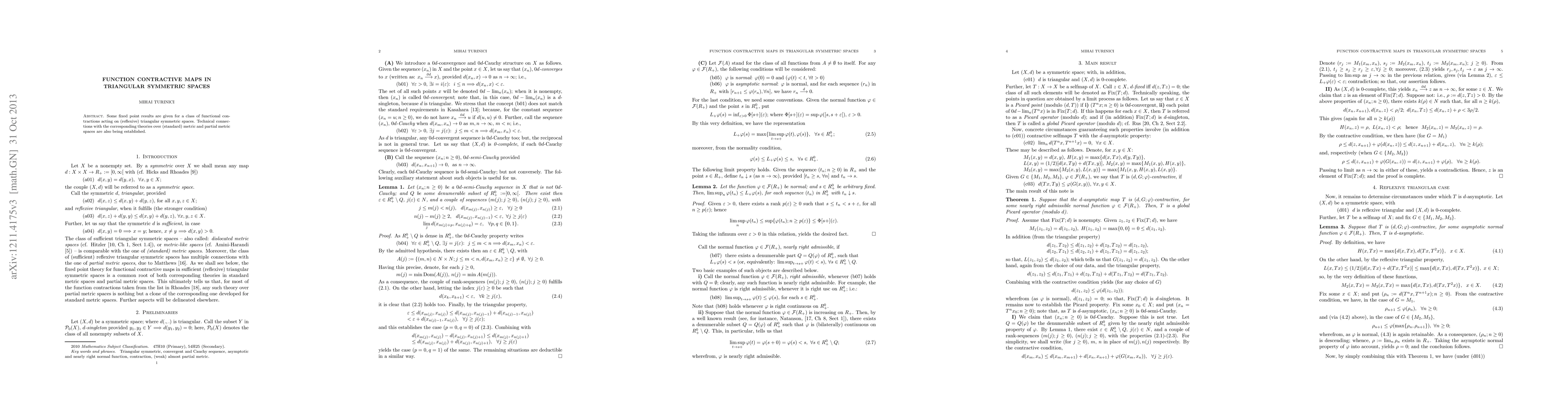 Some fixed point results are given for a class of functional contractions acting on (reflexive) triangular symmetric spaces. Technical connections with the corresponding theories over (standard) metric and partial metric spaces are also being established.