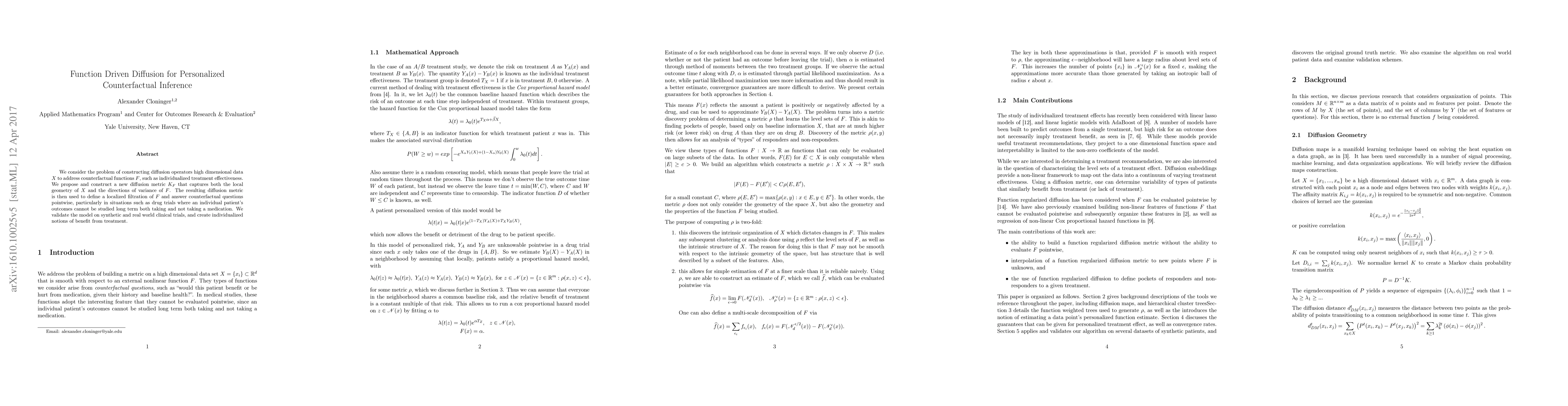We consider the problem of constructing diffusion operators high dimensional data $X$ to address counterfactual functions $F$, such as individualized treatment effectiveness. We propose and construct a new diffusion metric $K_F$ that captures both the local geometry of $X$ and the directions of variance of $F$. The resulting diffusion metric is then used to define a localized filtration of $F$ and answer counterfactual questions pointwise, particularly in situations such as drug trials where an individual patient's outcomes cannot be studied long term both taking and not taking a medication. We validate the model on synthetic and real world clinical trials, and create individualized notions of benefit from treatment.