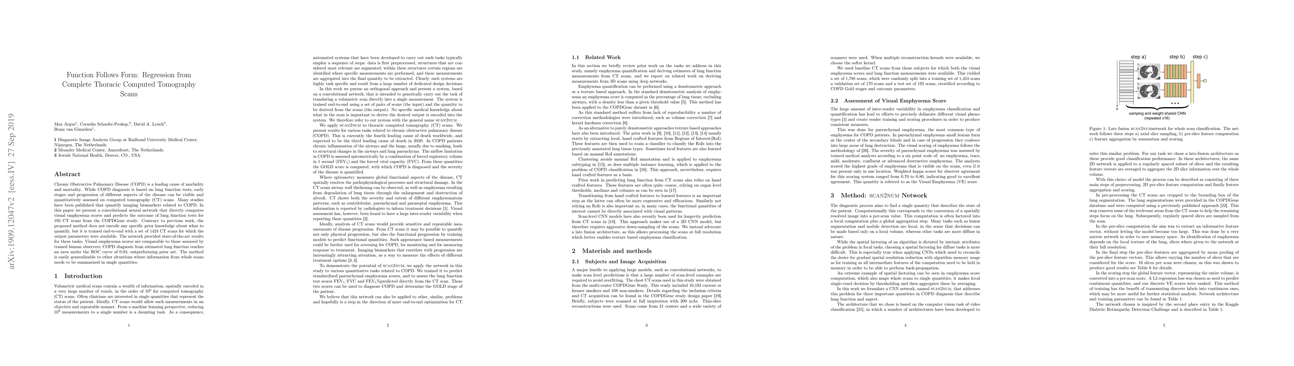 This paper introduces a convolutional neural network that predicts visual emphysema scores and lung function outcomes from complete thoracic CT scans, achieving state-of-the-art results in COPD diagnosis without relying on predefined imaging biomarkers. The network's success suggests its potential for broader application in summarizing scan data.