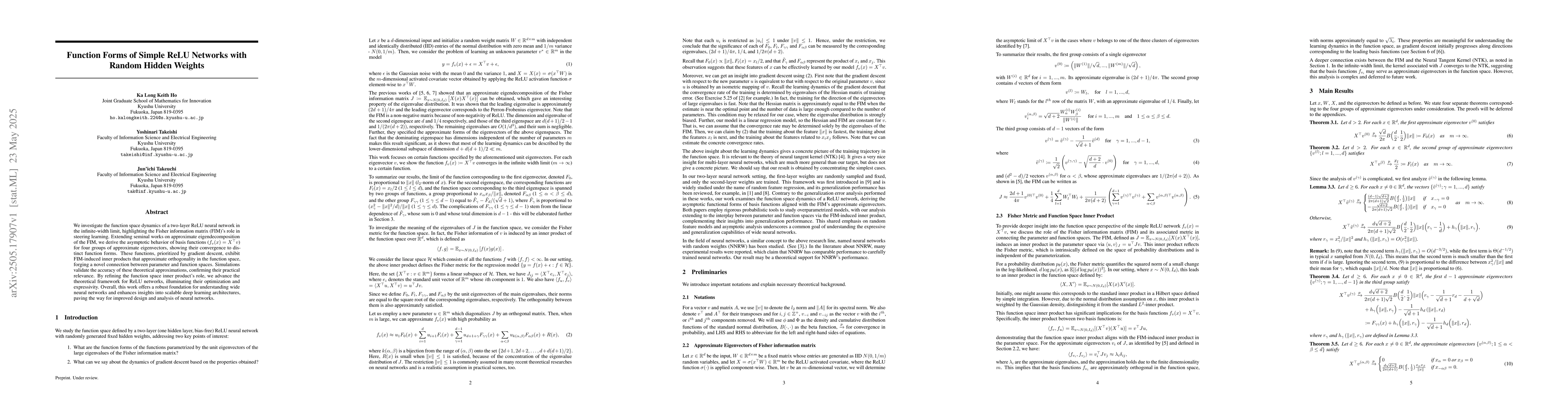 The research investigates the function space dynamics of a two-layer ReLU neural network in the infinite-width limit, focusing on the Fisher Information Matrix's role in guiding learning. It derives the asymptotic behavior of basis functions and their convergence to distinct function forms, validating these approximations through simulations.