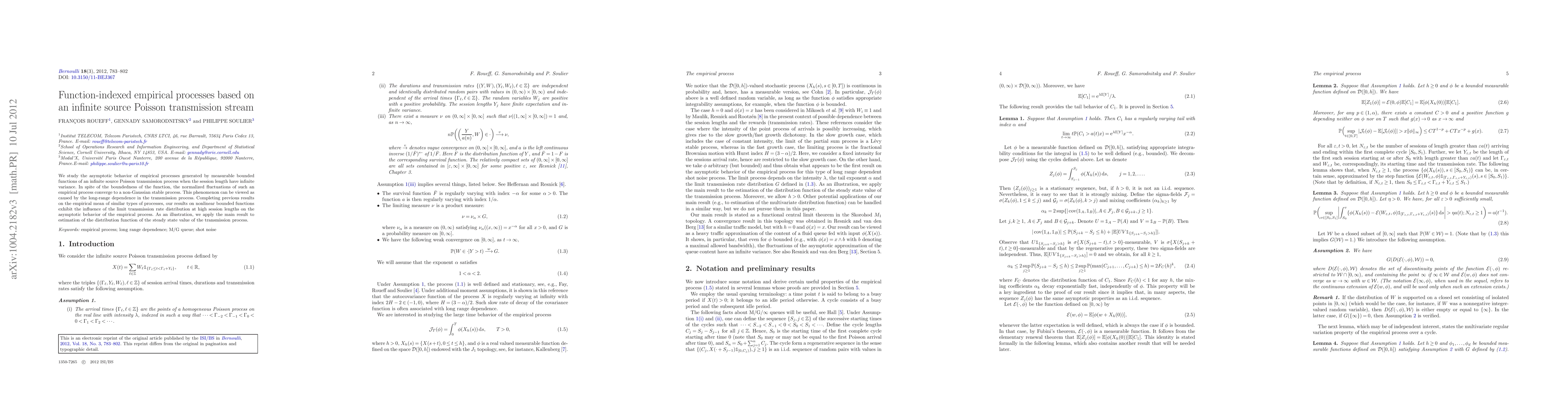We study the asymptotic behavior of empirical processes generated by measurable bounded functions of an infinite source Poisson transmission process when the session length have infinite variance. In spite of the boundedness of the function, the normalized fluctuations of such an empirical process converge to a non-Gaussian stable process. This phenomenon can be viewed as caused by the long-range dependence in the transmission process. Completing previous results on the empirical mean of similar types of processes, our results on non-linear bounded functions exhibit the influence of the limit transmission rate distribution at high session lengths on the asymptotic behavior of the empirical process. As an illustration, we apply the main result to estimation of the distribution function of the steady state value of the transmission process.