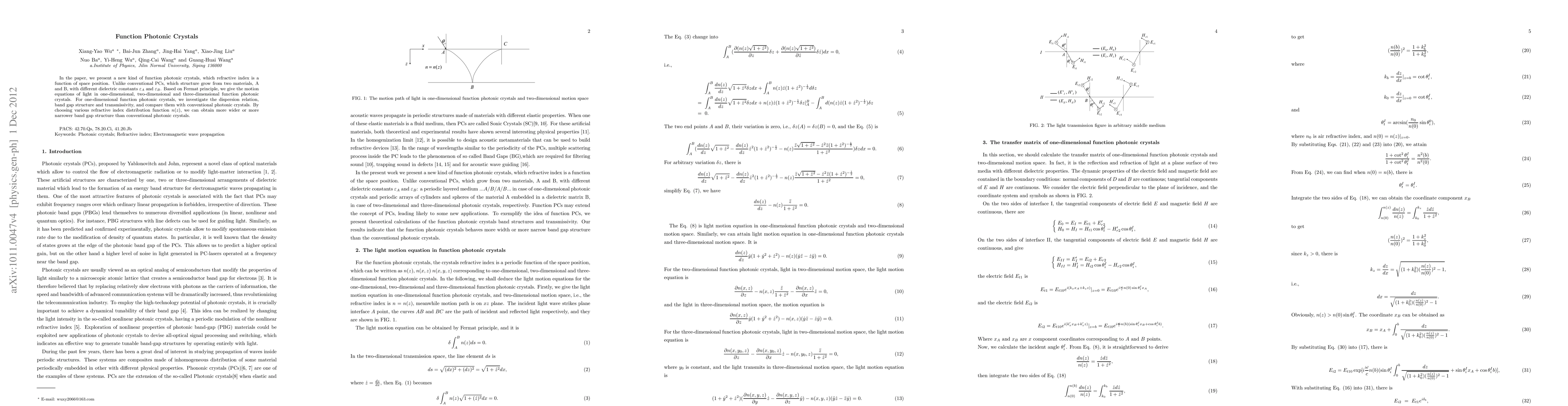 This paper introduces function photonic crystals where the refractive index varies spatially. It develops motion equations for light in one-, two-, and three-dimensional function photonic crystals, comparing their dispersion relations, band gaps, and transmissivity to conventional photonic crystals, revealing tunable band gap structures via different refractive index distributions.