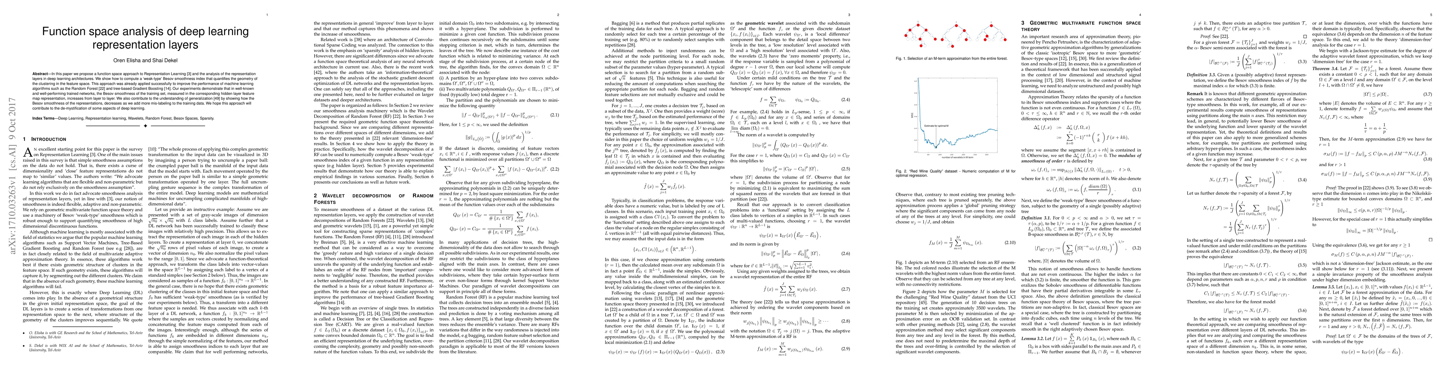 In this paper we propose a function space approach to Representation Learning and the analysis of the representation layers in deep learning architectures. We show how to compute a weak-type Besov smoothness index that quantifies the geometry of the clustering in the feature space. This approach was already applied successfully to improve the performance of machine learning algorithms such as the Random Forest and tree-based Gradient Boosting. Our experiments demonstrate that in well-known and well-performing trained networks, the Besov smoothness of the training set, measured in the corresponding hidden layer feature map representation, increases from layer to layer. We also contribute to the understanding of generalization by showing how the Besov smoothness of the representations, decreases as we add more mis-labeling to the training data. We hope this approach will contribute to the de-mystification of some aspects of deep learning.