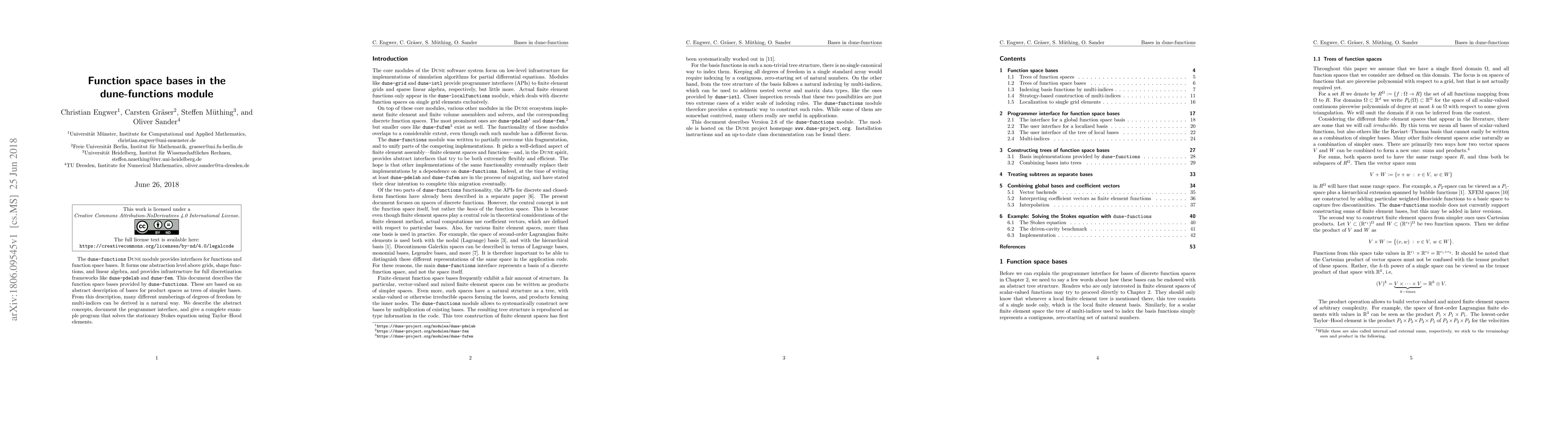 The dune-functions Dune module provides interfaces for functions and function space bases. It forms one abstraction level above grids, shape functions, and linear algebra, and provides infrastructure for full discretization frameworks like dune-pdelab and dune-fem. This document describes the function space bases provided by dune-functions. These are based on an abstract description of bases for product spaces as trees of simpler bases. From this description, many different numberings of degrees of freedom by multi-indices can be derived in a natural way. We describe the abstract concepts, document the programmer interface, and give a complete example program that solves the stationary Stokes equation using Taylor-Hood elements.
