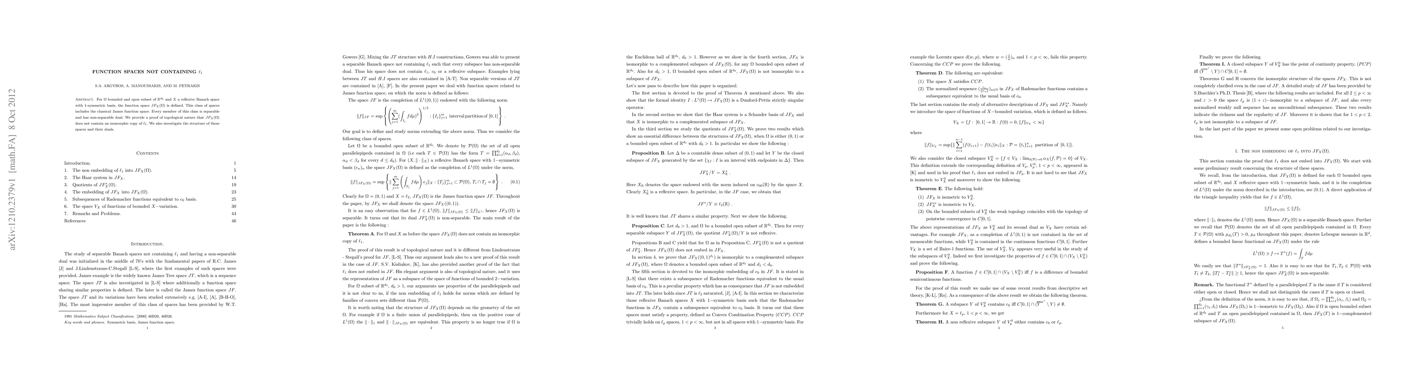 For $\Omega$ bounded and open subset of $\mathbb{R}^{d_{0}}$ and $X$ a reflexive Banach space with 1-symmetric basis, the function space $JF_{X}(\Omega)$ is defined. This class of spaces includes the classical James function space. Every member of this class is separable and has non-separable dual. We provide a proof of topological nature that $JF_{X}(\Omega)$ does not contain an isomorphic copy of $\ell_{1}$. We also investigate the structure of these spaces and their duals.