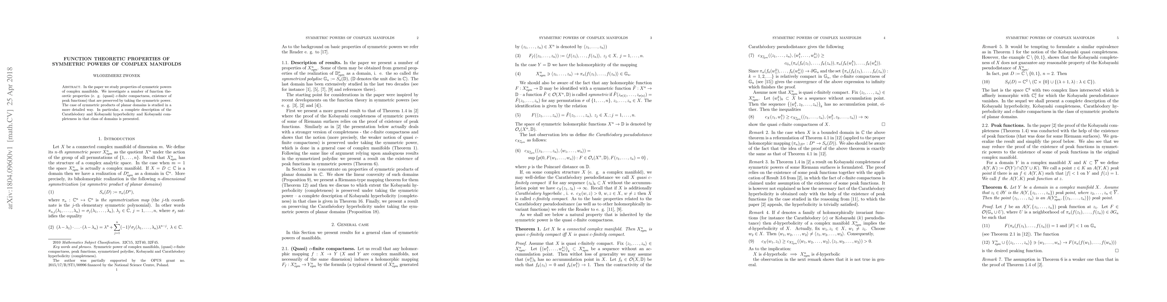 In the paper we study properties of symmetric powers of complex manifolds. We investigate a number of function theoretic properties (e. g. (quasi) $c$-finite compactness, existence of peak functions) that are preserved by taking the symmetric power. The case of symmetric products of planar domains is studied in a more detailed way. In particular, a complete description of the Carath\'eodory and Kobayashi hyperbolicity and Kobayashi completeness in that class of domains is presented.