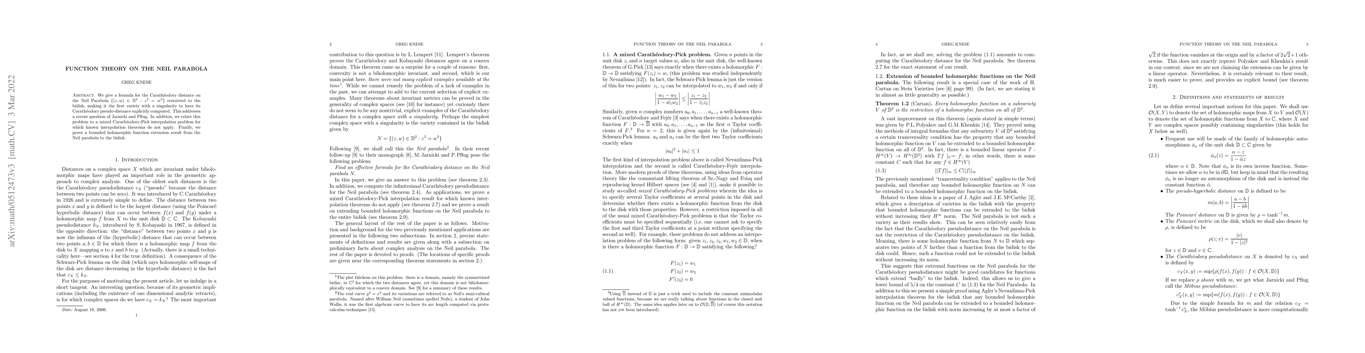 This paper computes the Carathéodory distance on the Neil parabola, a variety with a singularity, and relates it to a mixed interpolation problem. It also proves a holomorphic function extension result from the Neil parabola to the bidisk.