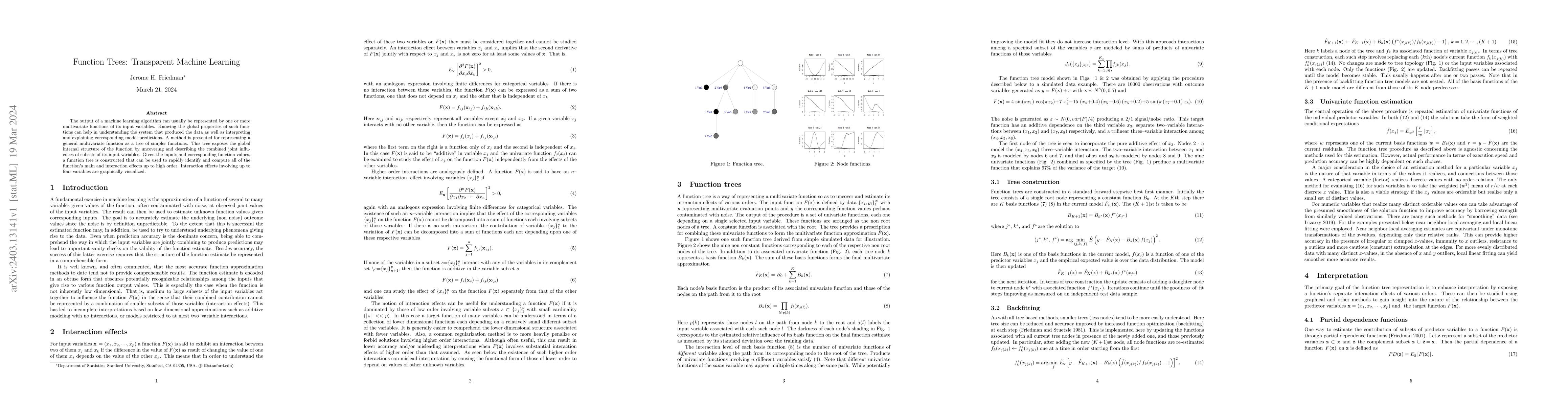 Function Trees offer a transparent method to represent multivariate functions from machine learning algorithms as a structured tree of simpler functions, revealing global properties and interaction effects of input variables, thereby aiding model interpretation and explanation. The method allows rapid identification of main and interaction effects, with up to four-variable interactions visually represented.