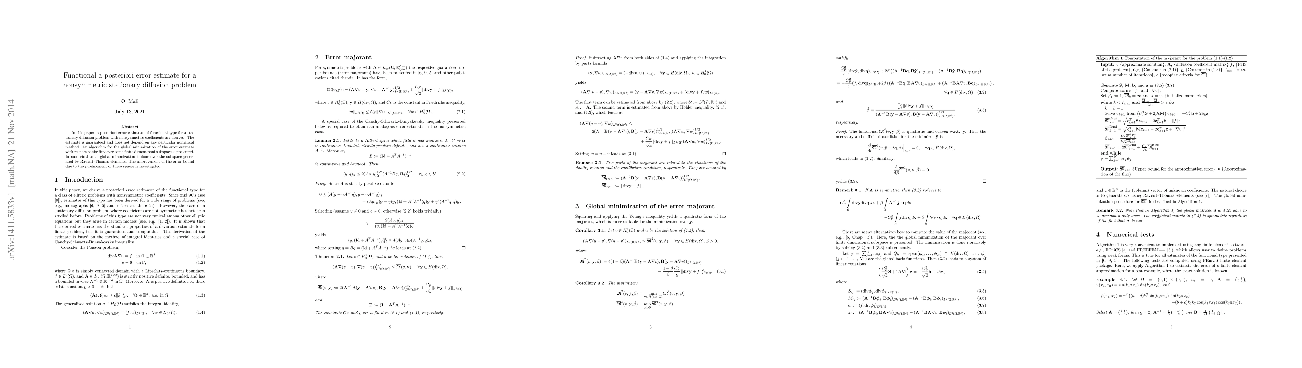 In this paper, a posteriori error estimates of functional type for a stationary diffusion problem with nonsymmetric coefficients are derived. The estimate is guaranteed and does not depend on any particular numerical method. An algorithm for the global minimization of the error estimate with respect to the flux over some finite dimensional subspace is presented. In numerical tests, global minimization is done over the subspace generated by Raviart-Thomas elements. The improvement of the error bound due to the p-refinement of these spaces is investigated.