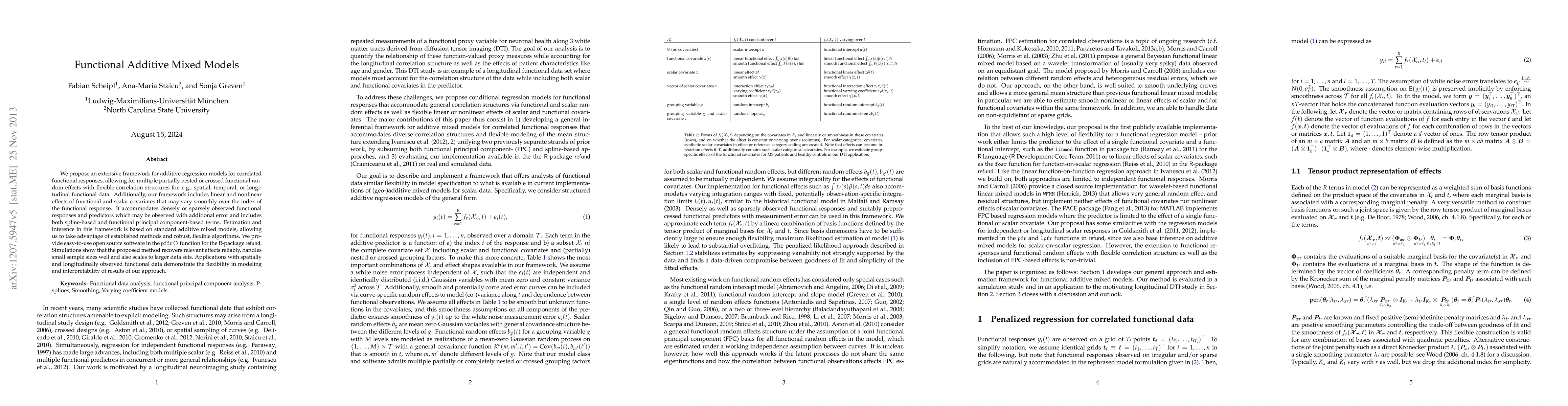 We propose an extensive framework for additive regression models for correlated functional responses, allowing for multiple partially nested or crossed functional random effects with flexible correlation structures for, e.g., spatial, temporal, or longitudinal functional data. Additionally, our framework includes linear and nonlinear effects of functional and scalar covariates that may vary smoothly over the index of the functional response. It accommodates densely or sparsely observed functional responses and predictors which may be observed with additional error and includes both spline-based and functional principal component-based terms. Estimation and inference in this framework is based on standard additive mixed models, allowing us to take advantage of established methods and robust, flexible algorithms. We provide easy-to-use open source software in the pffr() function for the R-package refund. Simulations show that the proposed method recovers relevant effects reliably, handles small sample sizes well and also scales to larger data sets. Applications with spatially and longitudinally observed functional data demonstrate the flexibility in modeling and interpretability of results of our approach.