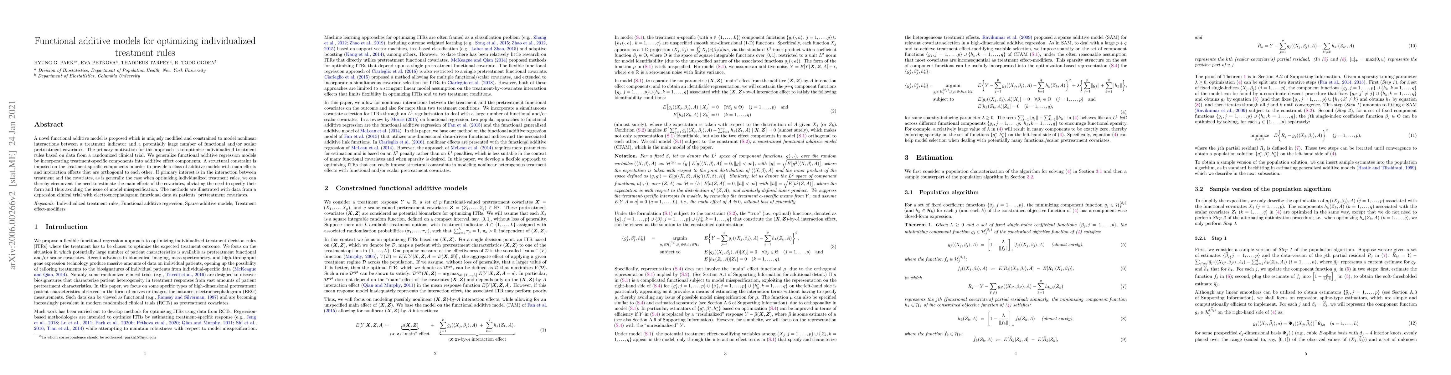 A novel functional additive model is proposed which is uniquely modified and constrained to model nonlinear interactions between a treatment indicator and a potentially large number of functional and/or scalar pretreatment covariates. The primary motivation for this approach is to optimize individualized treatment rules based on data from a randomized clinical trial. We generalize functional additive regression models by incorporating treatment-specific components into additive effect components. A structural constraint is imposed on the treatment-specific components in order to provide a class of additive models with main effects and interaction effects that are orthogonal to each other. If primary interest is in the interaction between treatment and the covariates, as is generally the case when optimizing individualized treatment rules, we can thereby circumvent the need to estimate the main effects of the covariates, obviating the need to specify their form and thus avoiding the issue of model misspecification. The methods are illustrated with data from a depression clinical trial with electroencephalogram functional data as patients' pretreatment covariates.