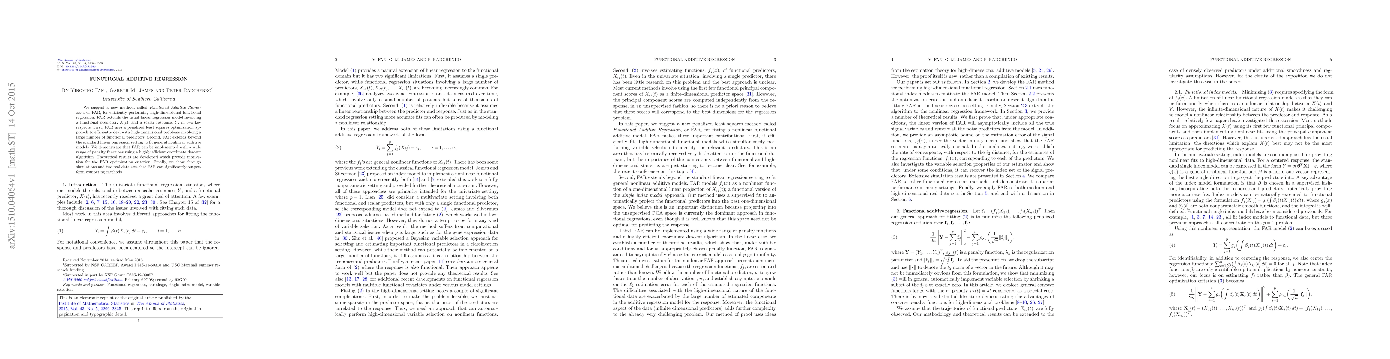 Functional Additive Regression (FAR) introduces a penalized least squares method for high-dimensional functional regression, extending beyond linear models to fit nonlinear additive models efficiently. The method employs a coordinate descent algorithm and outperforms competing methods in simulations and real data applications.