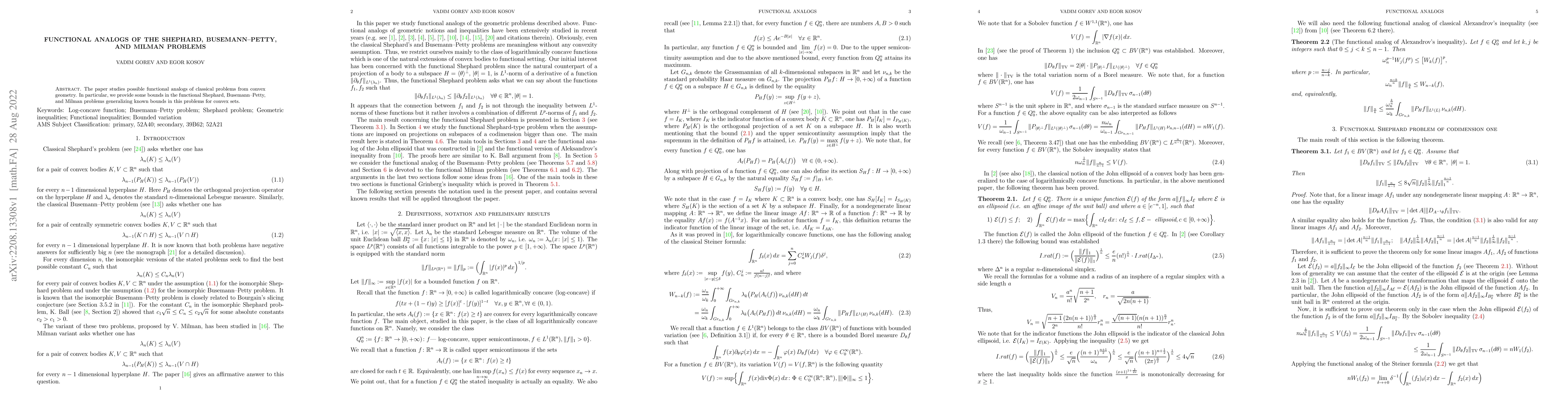 The paper explores functional analogs of classical convex geometry problems, specifically providing new bounds for the functional Shephard, Busemann-Petty, and Milman problems, extending existing results for convex sets.