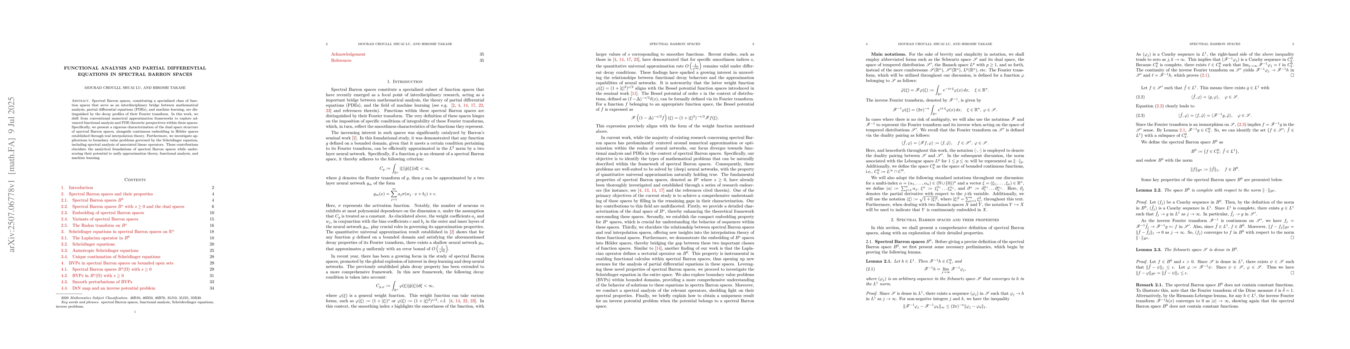 Spectral Barron spaces, constituting a specialized class of function spaces that serve as an interdisciplinary bridge between mathematical analysis, partial differential equations (PDEs), and machine learning, are distinguished by the decay profiles of their Fourier transform. In this work, we shift from conventional numerical approximation frameworks to explore advanced functional analysis and PDE theoretic perspectives within these spaces. Specifically, we present a rigorous characterization of the dual space structure of spectral Barron spaces, alongside continuous embedding in H\"older spaces established through real interpolation theory. Furthermore, we investigate applications to boundary value problems governed by the Schr\"odinger equation, including spectral analysis of associated linear operators. These contributions elucidate the analytical foundations of spectral Barron spaces while underscoring their potential to unify approximation theory, functional analysis, and machine learning.