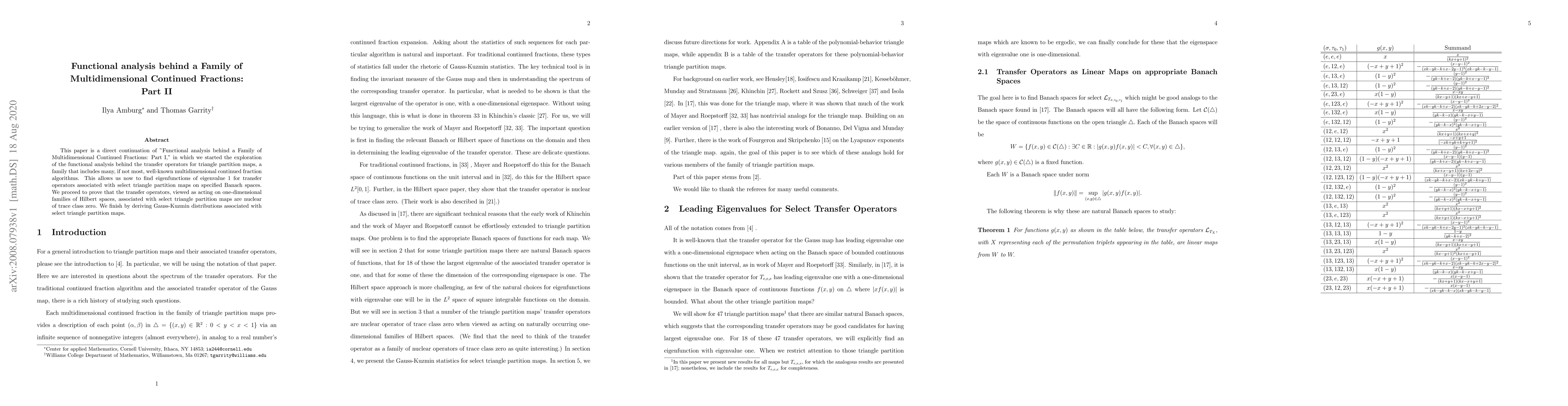 This paper continues the investigation of functional analysis for multidimensional continued fractions, focusing on transfer operators for triangle partition maps. It identifies eigenfunctions of eigenvalue 1 and proves that the associated transfer operators are nuclear of trace class zero, concluding with the derivation of Gauss-Kuzmin distributions.